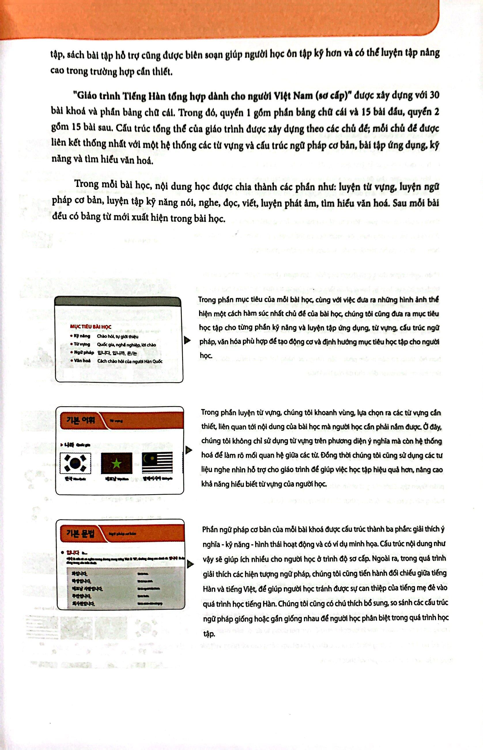 Tiếng Hàn Tổng Hợp Dành Cho Người Việt Nam - Sơ Cấp 1 Trong những năm gần đây, nhu cầu học tiếng Hàn và tìm hiểu về văn hóa Hàn Quốc đang có xu hướng tăng lên. Người học tiếng Hàn rất mong muốn có được một bộ giáo trình chuẩn, được biên soạn một cách tỉ mỉ và hữu ích nhất. Giáo trình tiếng Hàn tổng hợp lần đầu tiên được trao bản quyền chính thức tại Việt Nam Hiểu được điều đó, ngày 4-7, Đại diện chính phủ Hàn Quốc, ngài Woo Hyeong Min – Trưởng đại diện Văn phòng Quỹ giao lưu Quốc tế HQ tại Việt Nam cùng GS.TS.NGƯT Mai Ngọc Chừ – Chủ tịch Hội Nghiên cứu khoa học về Hàn Quốc của Việt Nam (KRAV) đã trao quyết định cho phép Công ty Cổ phần sách MCBooks của Việt Nam được xuất bản cuốn sách này tại thị trường Việt Nam. Và đây chính là bộ giáo trình tiếng Hàn tổng hợp đầu tiên có bản quyền chính thức có mặt tại Việt Nam. Cũng theo ông Woo Hyeong Min, Thực tế đây là bộ giáo trình chính thống mà tất cả người học tiếng Hàn tại Việt Nam cần sử dụng. Tuy nhiên nhiều năm qua bộ sách đến tay người dùng đều là sách lậu nên chưa đạt được kết quả mà chính phủ Hàn muốn mang tới Việt Nam. Do đó Chính phủ Hàn Quốc đã quyết định tìm 1 đơn vị xuất bản uy tín của Việt Nam để giúp họ mang đến cho người học những cuốn sách tiếng Hàn chất lượng tốt với giá cả hợp lý. Bộ giáo trình được Hội nghiên cứu khoa học Hàn Quốc của Việt Nam biên soạn và hiệu đính. Bộ giáo trình sẽ giúp nâng cao hiệu quả trong việc sử dụng ngôn ngữ Hàn sau tiếng mẹ đẻ và tiếng Anh, là nền tảng giúp người lao động Việt Nam nhận được những vị trí làm việc cao trong doanh nghiệp Hàn Quốc. Đây cũng là cách để thúc đẩy quan hệ hợp tác về văn hoá và giáo dục giữa hai nước trong thời gian tới. Giới thiệu cuốn Giáo trình tiếng Hàn tổng hợp dành cho người Việt Nam – Sơ cấp 1 Giáo trình tiếng Hàn tổng hợp dành cho người Việt Nam – Sơ cấp 1 được biên soạn dành cho người Việt Nam muốn học tiếng Hàn ở trình độ sơ cấp. Sách được biên soạn nhằm hướng tới việc sử dụng được trong các tiết học tiếng Hàn tại giảng đường đại học nên mỗi bài học được chia thành nhiều phần như: Lý thuyết cơ bản gồm từ vựng và cấu trúc ngữ pháp; phần luyện tập theo 4 kỹ năng giao tiếp như: Nghe – Nói – Đọc – Viết, phần luyện phát âm, phần tìm hiểu văn hóa… Các chủ đề trong sách được sắp xếp một cách có hệ thống và liên quan chặt chẽ với nhau. Giáo trình tiếng Hàn tổng hợp được biên soạn kèm theo một cuốn sách bài tập hỗ trợ giúp người học ôn tập kỹ hơn và có thể luyện tập nâng cao trong những trường hợp cần thiết. Nội dung trong Giáo trình tiếng Hàn tổng hợp – Sơ cấp 1 2 cuốn sách trong bộ Sơ cấp được xây dựng với 30 bài khóa và bảng chữ cái. Trong đó quyển 1 gồm phần bảng chữ cái và 15 bài đầu. Học hết quyển 1, bạn sẽ học đến quyển sơ cấp 2 với 15 bài còn lại. Cấu trúc tổng thể của giáo trình được xây dựng theo các chủ đề; mỗi chủ đề được liên kết thống nhất với một hệ thống các từ vựng và cấu trúc ngữ pháp cơ bản, bài tập ứng dụng, kỹ năng và tìm hiểu văn hóa. Trong mỗi bài học, nội dung học được chia thành các phần như: luyện từ vựng, luyện ngữ pháp cơ bản, luyện tập kỹ năng nghe – nói – đọc – viết, luyện phát âm, tìm hiểu văn hóa của đất nước Hàn Quốc xinh đẹp. Và kết thúc mỗi bài đều có thêm bảng từ mới xuất hiện trong bài học. Phần cuối của sách, các tác giả đưa ra hệ thống từ mới được sắp xếp theo thứ tự của bảng chữ cái. Đây là những từ không xuất hiện trong phần ngữ pháp, từ vựng cơ bản; nhưng lại xuất hiện nhiều ở phần luyện tập của từng bài.