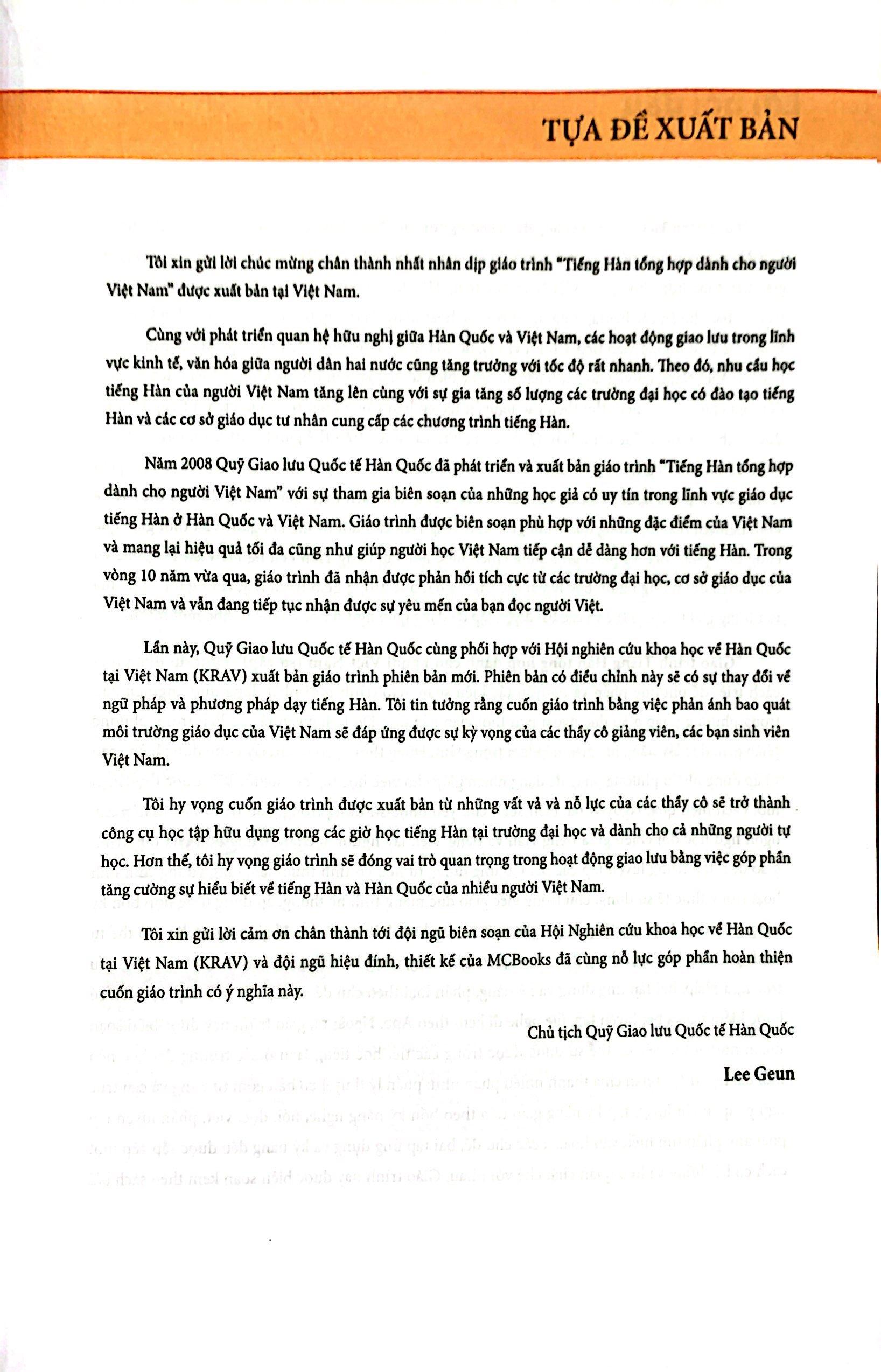 Hiểu được điều đó, ngày 4-7, Đại diện chính phủ Hàn Quốc, ngài Woo Hyeong Min – Trưởng đại diện Văn phòng Quỹ giao lưu Quốc tế HQ tại Việt Nam cùng ƯT Mai Ngọc Chừ – Chủ tịch Hội Nghiên cứu khoa học về Hàn Quốc của Việt Nam (KRAV) đã trao quyết định cho phép Công ty Cổ phần sách MCBooks của Việt Nam được xuất bản cuốn sách này tại thị trường Việt Nam. Và đây chính là bộ giáo trình tiếng Hàn tổng hợp đầu tiên có bản quyền chính thức có mặt tại Việt Nam.