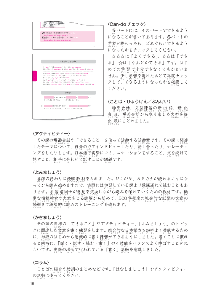 Giáo trình được biên soạn nhằm giúp người học giao tiếp bằng tiếng Nhật tốt hơn trong các hoạt động xã hội. Các tình huống học tập trong giáo trình là những tình huống thường được sử dụng để giao tiếp trên thực tế, được lựa chọn từ các lĩnh vực trong đời sống sinh hoạt, trường học và xã hội. Cách học được tổ chức theo hình thức đặc biệt ưu tiên việc "Giao tiếp" hơn là "Hiểu" từ vựng và ngữ pháp. [Hội thoại tình huống -> Xác nhận mẫu câu -> Luyện tập mẫu câu -> Hội thoại ứng dụng] Giáo trình bao gồm 2 sách giáo khoa sơ cấp 1, 2, hai quyển Work book sơ cấp 1,2 và 1 quyển Bản dịch và giải thích ngữ pháp.