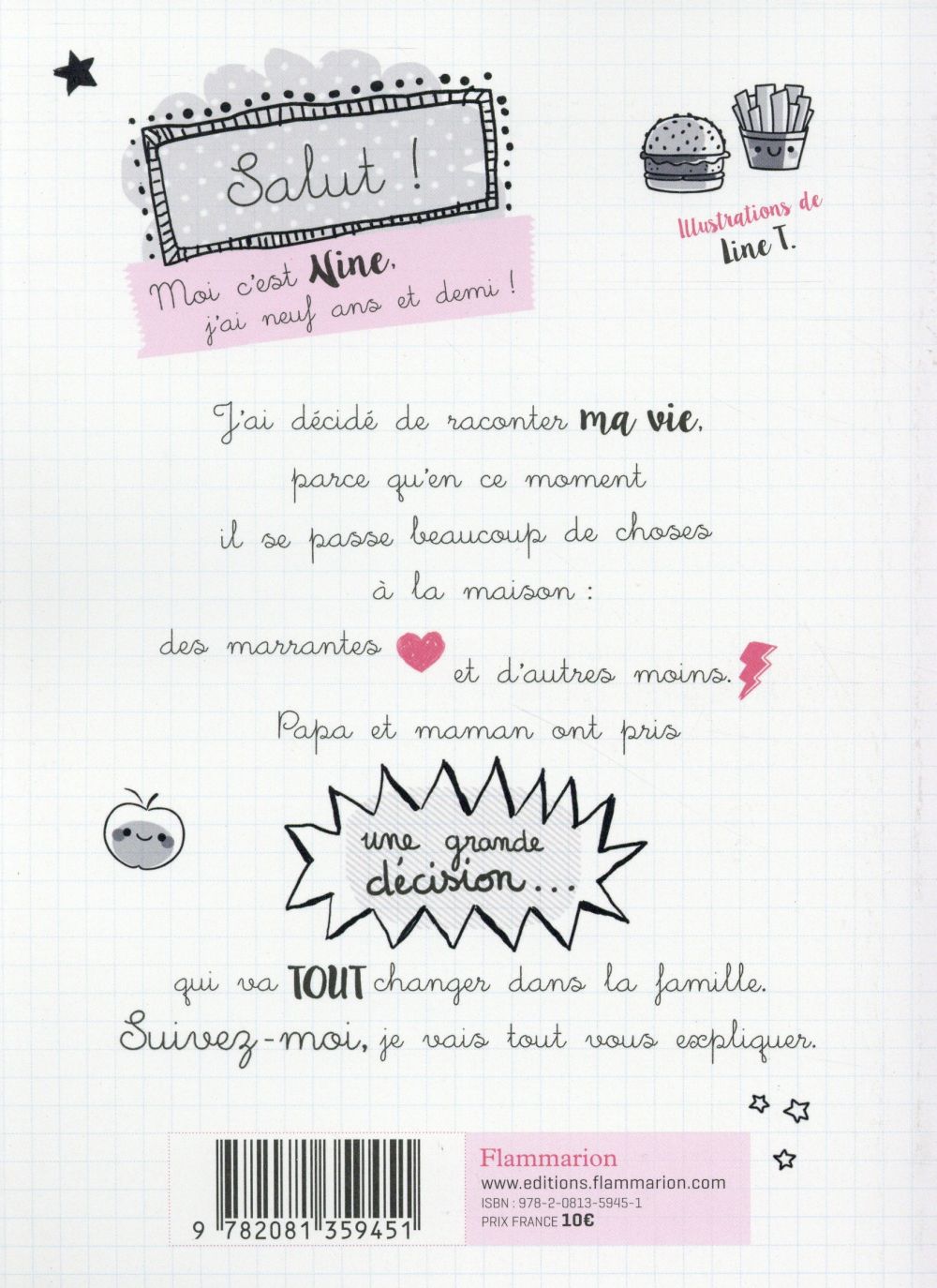 Moi c'est Nine, j'ai neuf ans et demi ! J'ai décidé de raconter ma vie, parce qu'en ce moment il se passe beaucoup de choses à la maison : des marrantes et d'autres moins. Papa et maman ont pris une grande dé qui va Tout changer dans la famille. Suivez-moi, je vais tout vous expliquer