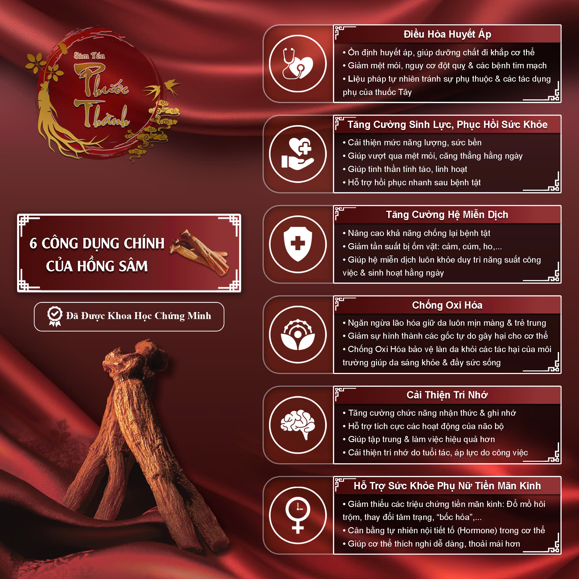THÀNH PHẦN - 100% nhân sâm Wisconsin Hoa Kỳ. CÔNG DỤNG - Bồi bổ nguyên khí, hỗ trợ tăng cường sinh lực. - Hỗ trợ cho tinh thần tỉnh táo, minh mẫn. - Hỗ trợ