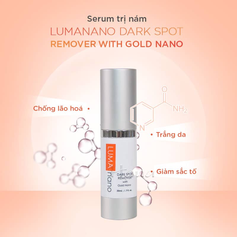 Công dụng chính Serum giảm nám da Luma Nano - Làm trắng da và cân bằng sắc tố da - Giảm sự tăng sắc tố gây ra nám ở những làn da lão hóa và tuyệt đối an toàn cho da - Phục hồi cả tình trạng da đang yếu để da càng mịn màng và khỏe khoắn hơn - Làm đều tone màu da hơn trong khoảng thời gian ngắn nhất - Giúp giảm viêm và tình trang da đang kích ứng - Giúp ức chế và loại bỏ các mảng nám, đốm nâu, vệt sạm lâu năm - Thẩm thấu sâu vào bên trong, ức chế và đào thải hắc sắc tố melanin - Nuôi dưỡng, tái tạo cho da sáng mịn, giảm sự hình thành nếp nhăn, khả năng ngăn ngừa lão hóa da - Tăng cường độ ẩm cho da luôn mềm mịn khi dùng