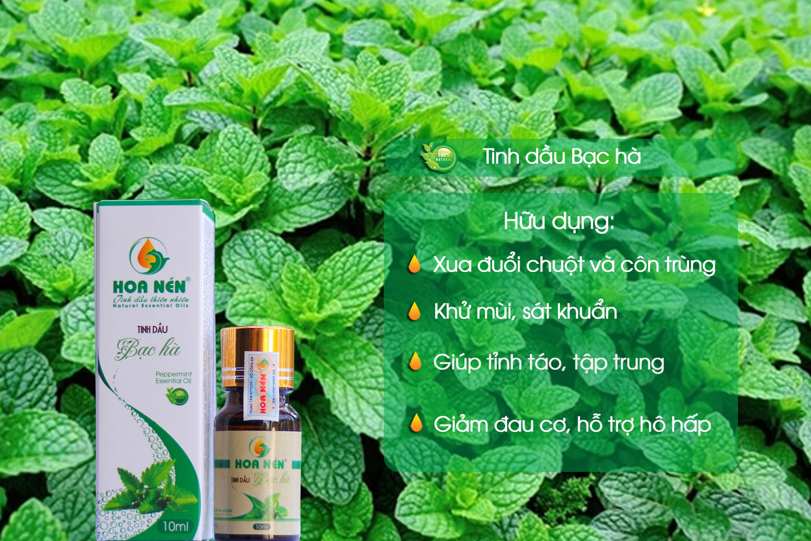 Thành phần chính của tinh dầu Bạc Hà:– Chiết xuất từ cây bạc hà bằng phương pháp lôi cuốn hơi nước.– Tinh chất Menthol và menthone là 2 thành phần chính của tinh dầu Bạc HàCông dụng tinh dầu Bạc hà :– Hỗ trợ điều trị hơi thở có mùi, xoa dịu các chứng khó chịu của bao tử, giảm đau bụng, đầy hơi, nhức đầu, khó tiêu, ợ nóng.– Xoa dịu sự giận dữ, sự mệt mỏi, trầm cảm. Giúp giảm đau xoang và nhức đầu.Cách dùng Tinh dầu Bạc Hà:– Nhỏ vài giọt tinh dầu cùng đèn xông.– Xoa 1, 2 giọt lên thái dương, trán hay vùng xoang (cẩn thận tránh tiếp xúc với mắt) giúp giảm đau xoang và nhức đầu.– Khuếch tán tinh dầu bạc hà để bớt thèm ăn.– Pha với dầu jojoba, Oliu và thoa lên vùng bao tử khi bị khó chịu.– Chà vài giọt lên bàn chân để giảm sốt.– Dùng để bôi lên chỗ bị ngứa khi bị côn trùng cắn.– Điều tiết da dầu, làm se và sạch da.– Nhỏ tinh dầu bạc hà vào đường chuột chạy chuột sẽ không dám đi qua, nếu xông tinh dầu chuột cũng sẽ bỏ đi.Lưu ý Tinh dầu Bạc hà:– Không uống tinh dầu nguyên chất, Không để rớt vào mắt.– Tránh ánh sáng mặt trời trực tiếp, để xa tầm tay trẻ em.– Nên mua tinh dầu có thương hiệu rõ ràng, và kiểm tra chất lượng kỹ trước khi sử dụng tránh trường hợp dùng phải dầu đã pha chế với hóa chất.– Một số dầu nền có thể sử dụng kết hợp với tinh dầu nguyên chất như như: Dầu dừa, dầu Hướng Dương, dầu Hạnh Nhân, dầu Oliu, dầu Mù U trong làm đẹp và trị liệu