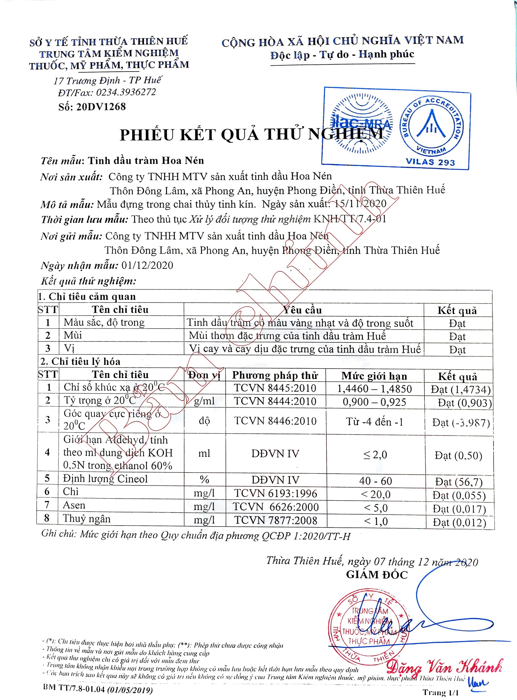 Mua tại TiktokTinh dầu Tràm Huế nguyên chất Hoa Nén 50ml Sản phẩm Tinh dầu tràm của Công ty TNHH MTV Sản xuất Tinh dầu HOA NÉN, được chiết xuất từ 100% cây tràm gió thiên nhiên. Theo quy định của Dược điển Việt Nam III, hàm lượng Cineol trong dầu đạt 40%- 60% là Dầu Tràm; >60% là đạt tinh dầu tràm. TINH DẦU TRÀM HOA NÉN với hàm lượng cineol chiếm 67,5% (theo Dược điển Việt Nam III), đã được Sở Y tế Thừa Thiên Huế kiểm định chất lượng và đã được Chi cục đo lường chất lượng xác nhận công bố chất lượng sản phẩm. Thành phần