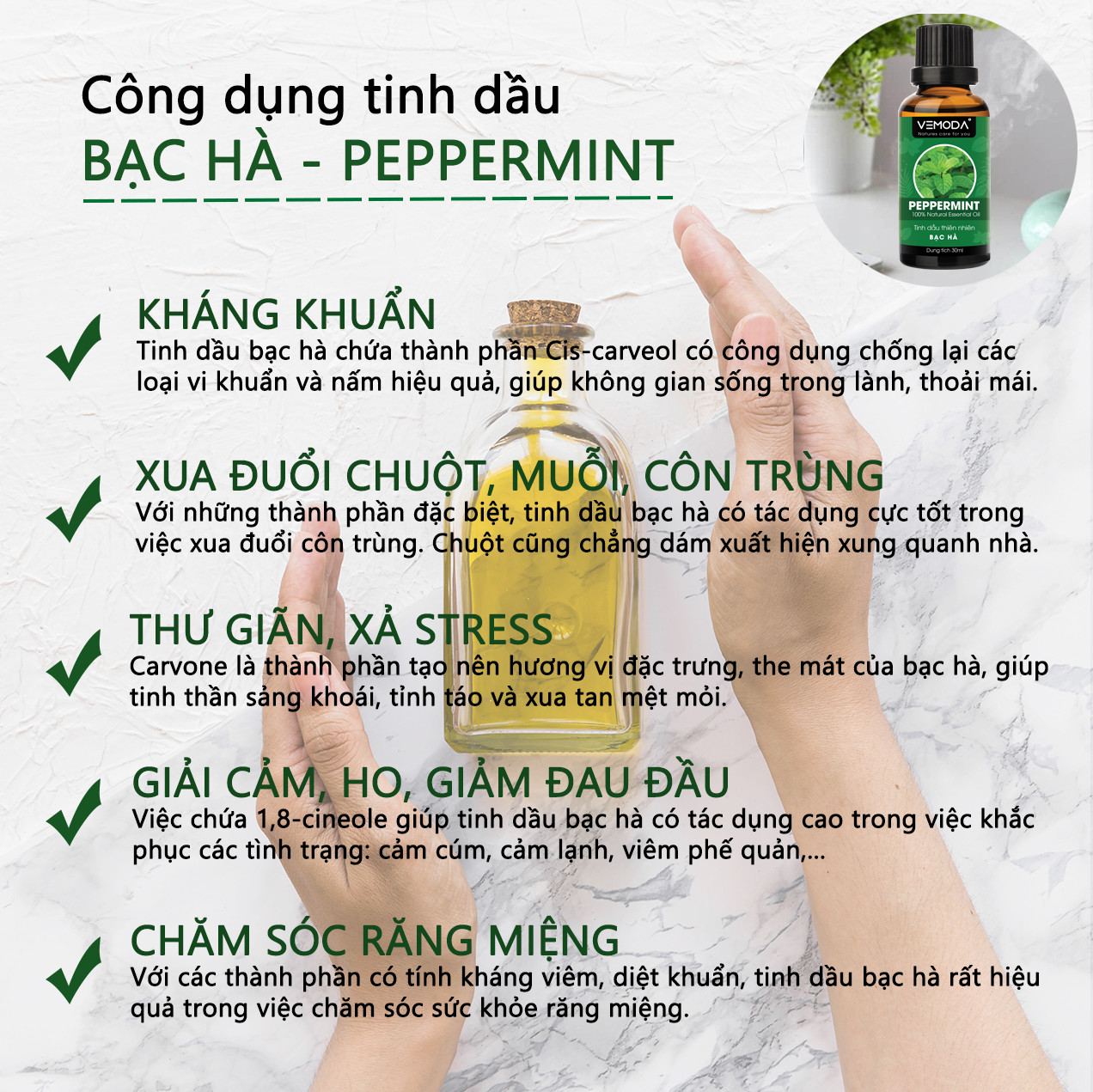 TINH DẦU BẠC HÀ CAO CẤP VEMODA 10ML Tinh dầu Bạc hà cao cấp VEMODA giúp thư giãn, kháng khuẩn, giải cảm, xua đuổi côn trùng, chăm sóc răng miệng Tinh dầu Bạc hà cao