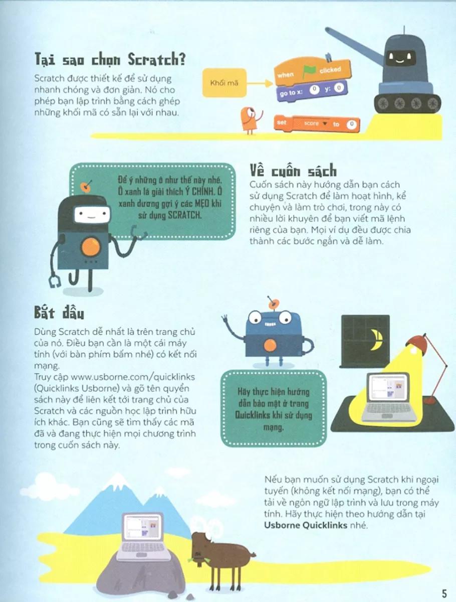 Mua tại TiktokCẩm nang hướng dẫn hoàn chỉnh và đơn giản nhất dành cho bạn trẻ bắt đầu học lập trình Ngôn ngữ lập trình Scratch đặc biệt phù hợp cho bạn trẻ mới học, vì tính tương tác trực quan, đồ họa sống động, ra sản phẩm liền tay mà vẫn đảm bảo khoa học và liên thông tri thức sau này. Chỉ cần nắm và kéo các khối lệnh đầy màu sắc có sẵn để lắp ghép thành một kịch bản điều khiển các đối tượng trên màn hình. Không có những dòng lệnh logic khô cứng và dễ lỗi, những khái niệm kỹ thuật khó hiểu, những quy tắc luật lệ chằng chịt và mệt mỏi trong các ngôn ngữ lập trình kiểu người lớn.