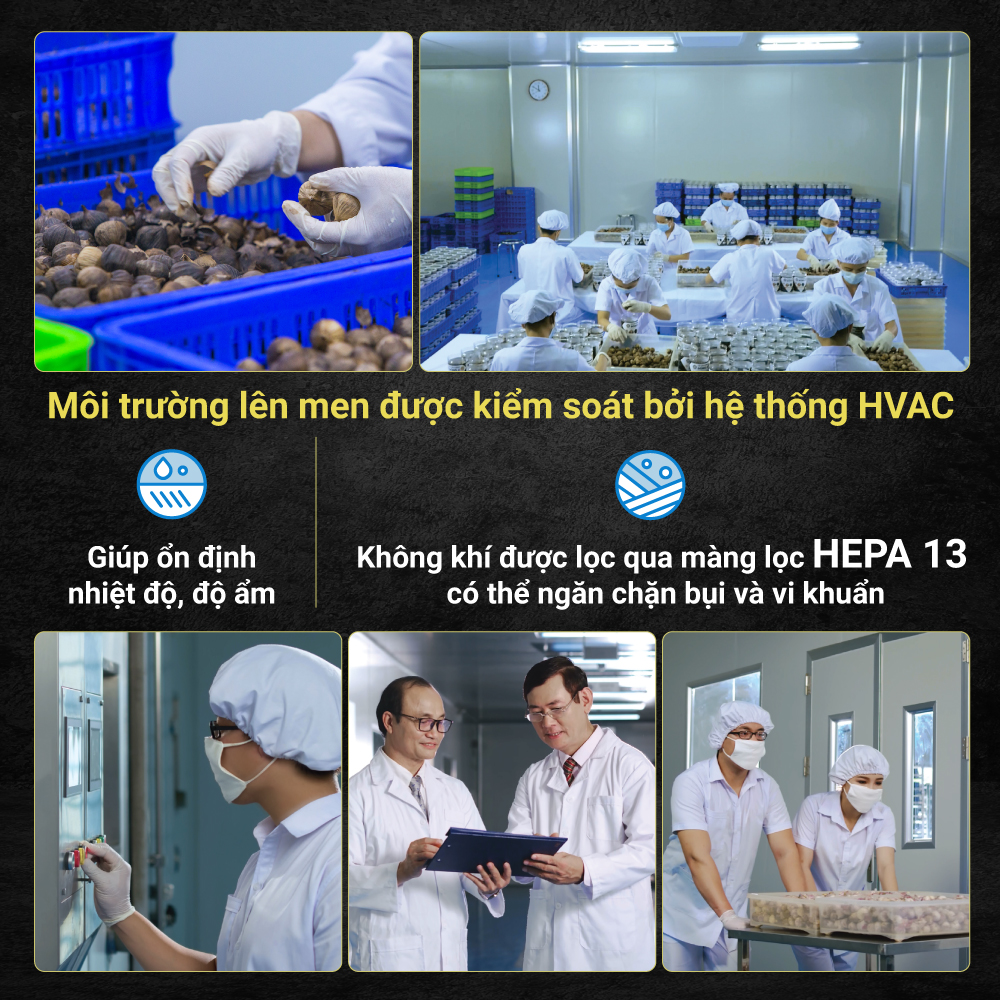 Nhà máy có 16 buồng lên men tỏi đen với trang thiết bị hiện đại đạt . Tất cả các buồng lên men được kiểm soát nhiệt độ, độ ẩm, ánh sáng … bằng các thiết bị cảm biến điện tử tân tiến và hiện đại.