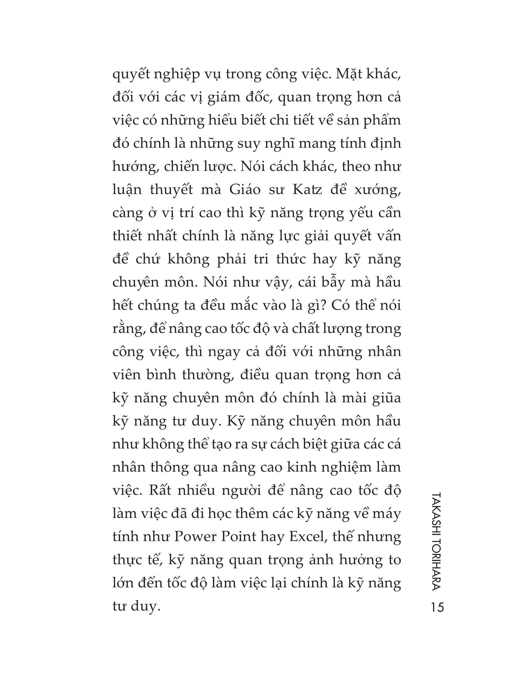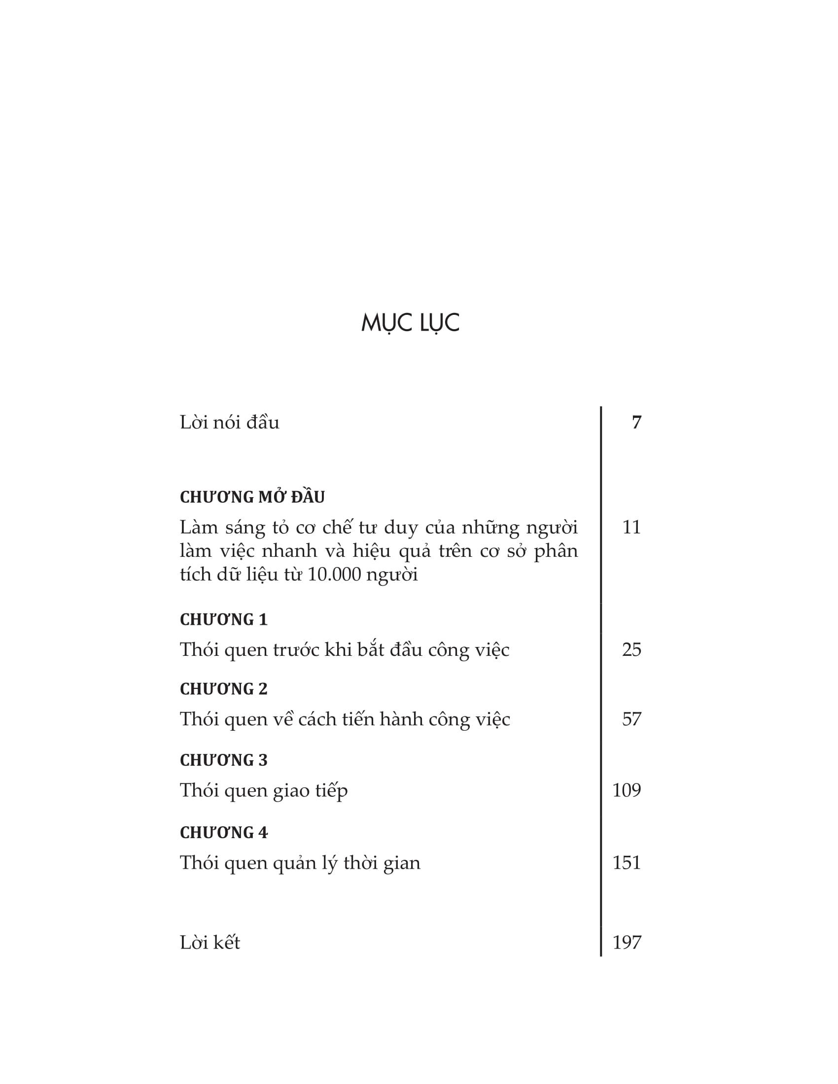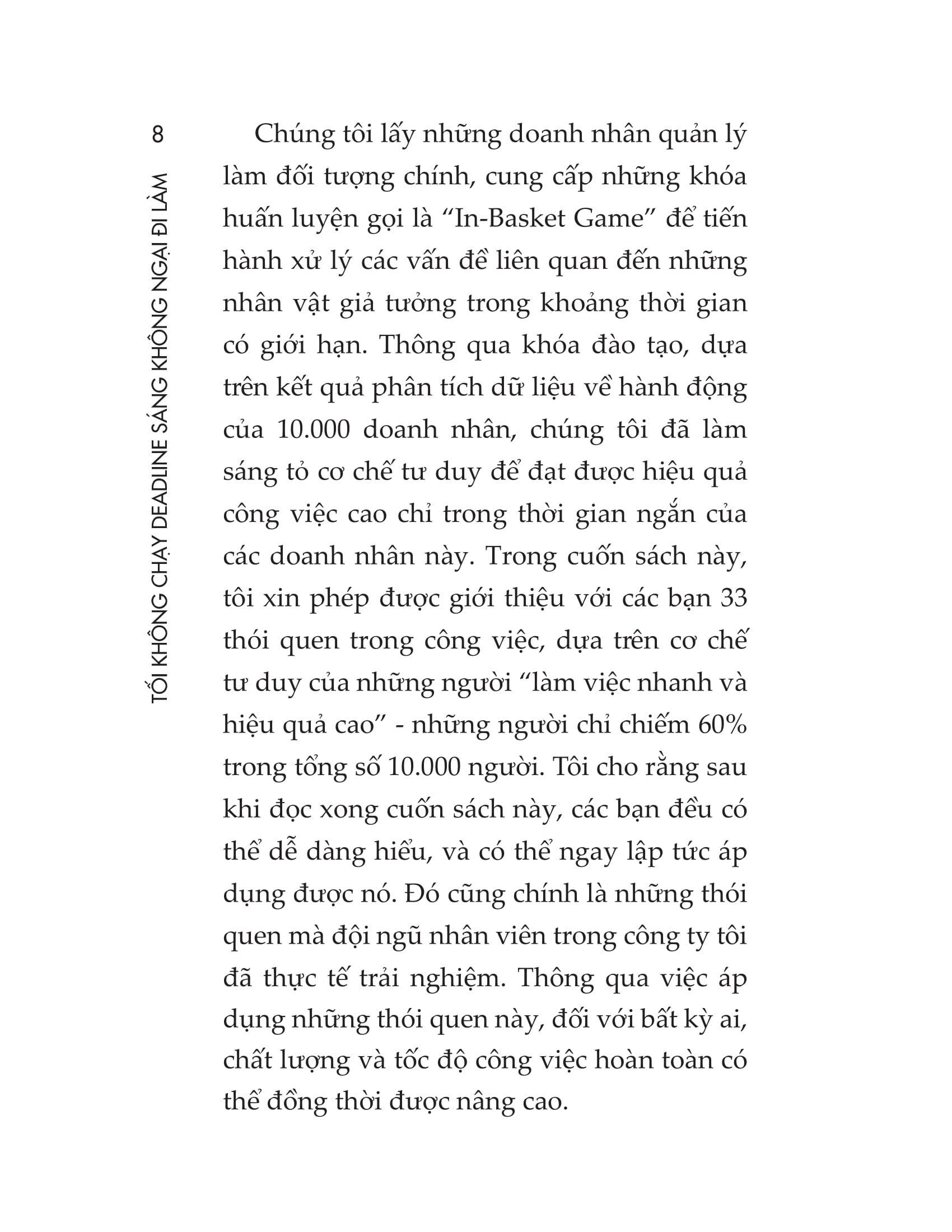 - Biết giao tiếp chuyên nghiệp để phục vụ công việc Cuốn sách này sẽ giúp mỗi chúng ta nâng cao cả chất lượng công việc lẫn tốc độ làm việc, thông qua việc vận hành cơ chế tư duy nhằm làm việc đạt hiệu quả cao trong thời gian ngắn. Thông qua việc giới thiệu 33 thói quen trong công việc, cuốn sách giúp bạn dễ dàng hiểu và áp dụng những phương quản lý công việc, khiến bạn trở thành một trong những nhân viên ưu tú nhất, luôn được cấp trên và đồng nghiệp tin cậy.