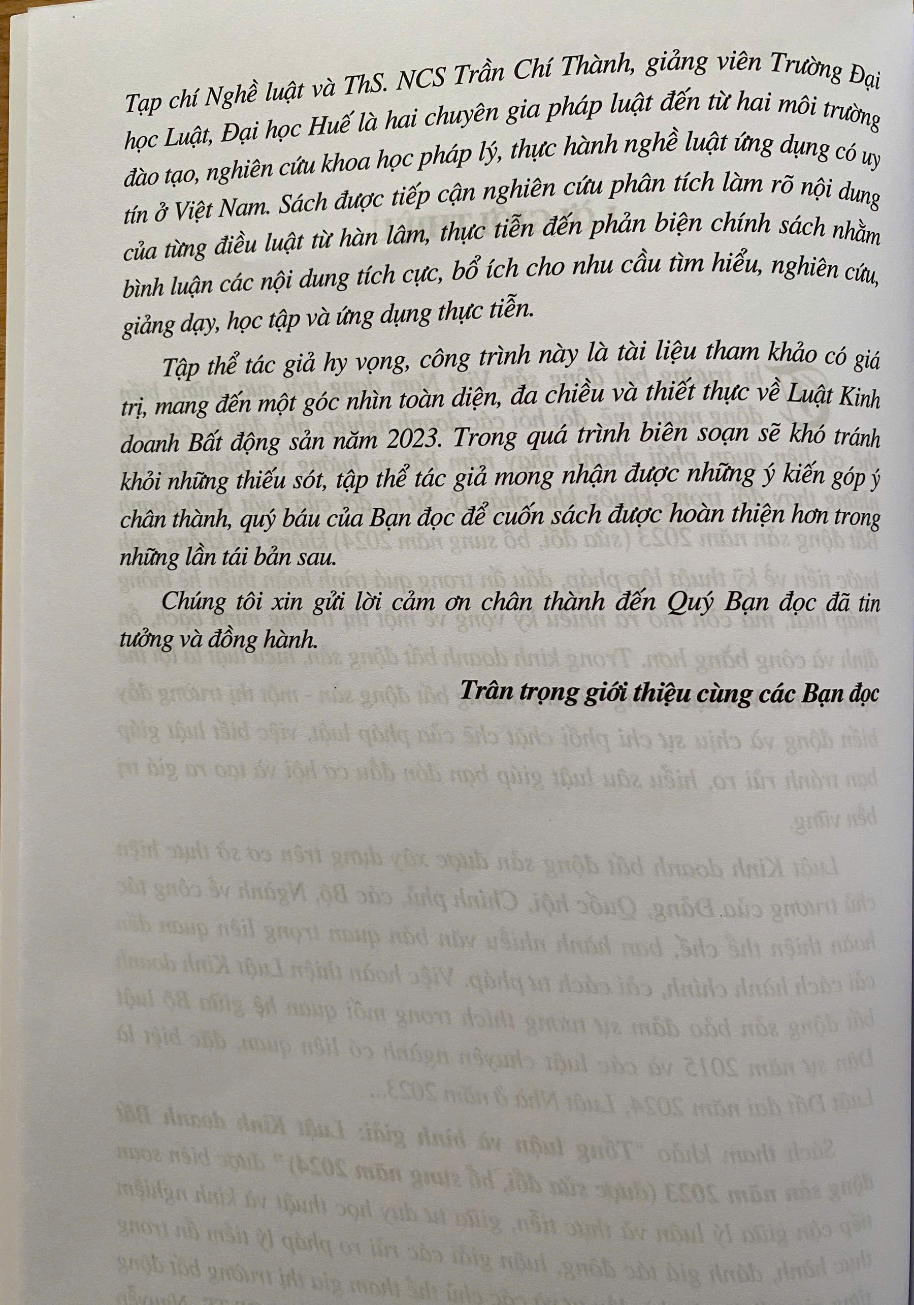 Tập thể tác giả hy vọng, công trình này là tài liệu tham khảo có giá trị, mang đến một góc nhìn toàn diện, đa chiều và thiết thực về Luật Kinh doanh Bất động sản năm 2023. Trong quá trình biên soạn sẽ khó tránh khỏi những thiếu sót, tập thể tác giả mong nhận được những ý kiến góp ý chân thành, quý báu của Bạn đọc để cuốn sách được hoàn thiện hơn trong những lần tái bản sau.