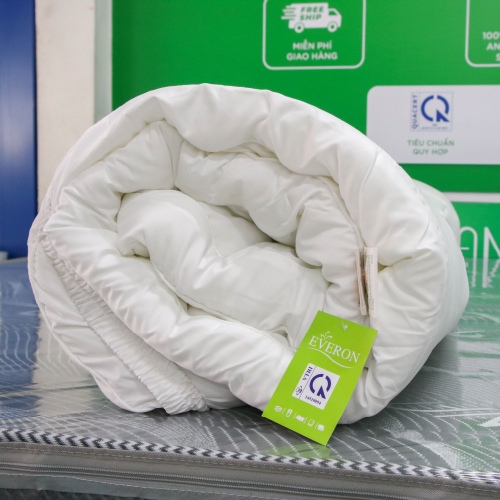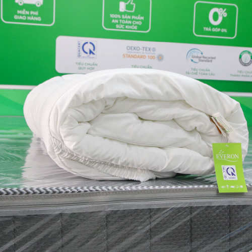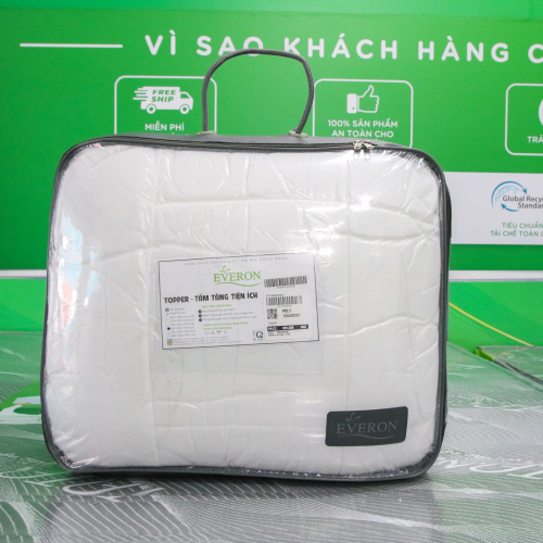 - Topper EVERON của chăn ra gối nệm cao cấp Everon sẽ mang chất lượng phòng ngủ của khách sạn 5 sao đến với gia đình yêu thương của bạn, mang đến sự sang trọng, đẳng cấp cùng cảm giác mới mẻ, êm ái, nhẹ nhàng. -Topper EVERON sử dụng vải Microsilk 100%, với ruột gòn siêu mịn bên trong, đây là dạng gòn khổ tấm lớn, phủ kín toàn bộ diện tích nệm, kết hợp với đó là các sợi gòn siêu mịn tạo nên sự liên kết bền chặt. -Bạn sẽ cảm nhận được sự mềm mại ngay từ lần đầu tiên chạm vào sản phẩm, mang đến cho bạn chuẩn mực trải nghiệm hoàn toàn mới. -Topper EVERON áp dụng phương pháp chần gòn công nghệ mới của chăn ra gối nệm cao cấp everon, khiến topper có độ phồng tuyệt đối, giúp topper lún sâu, êm và mềm mại hơn hẳn các topper thông thường. -Độ dày của Topper EVERON đặt chuẩn khoản 7cm, đây là tiêu chuẩn của khách sạn 5 sao, vậy nên dù thời gian sử dụng bao lâu, bạn vẫn yên tâm, thoải mái tận hưởng cảm giác thoải mái, nhẹ nhàng, mềm mại như phút ban đầu sử dụng.