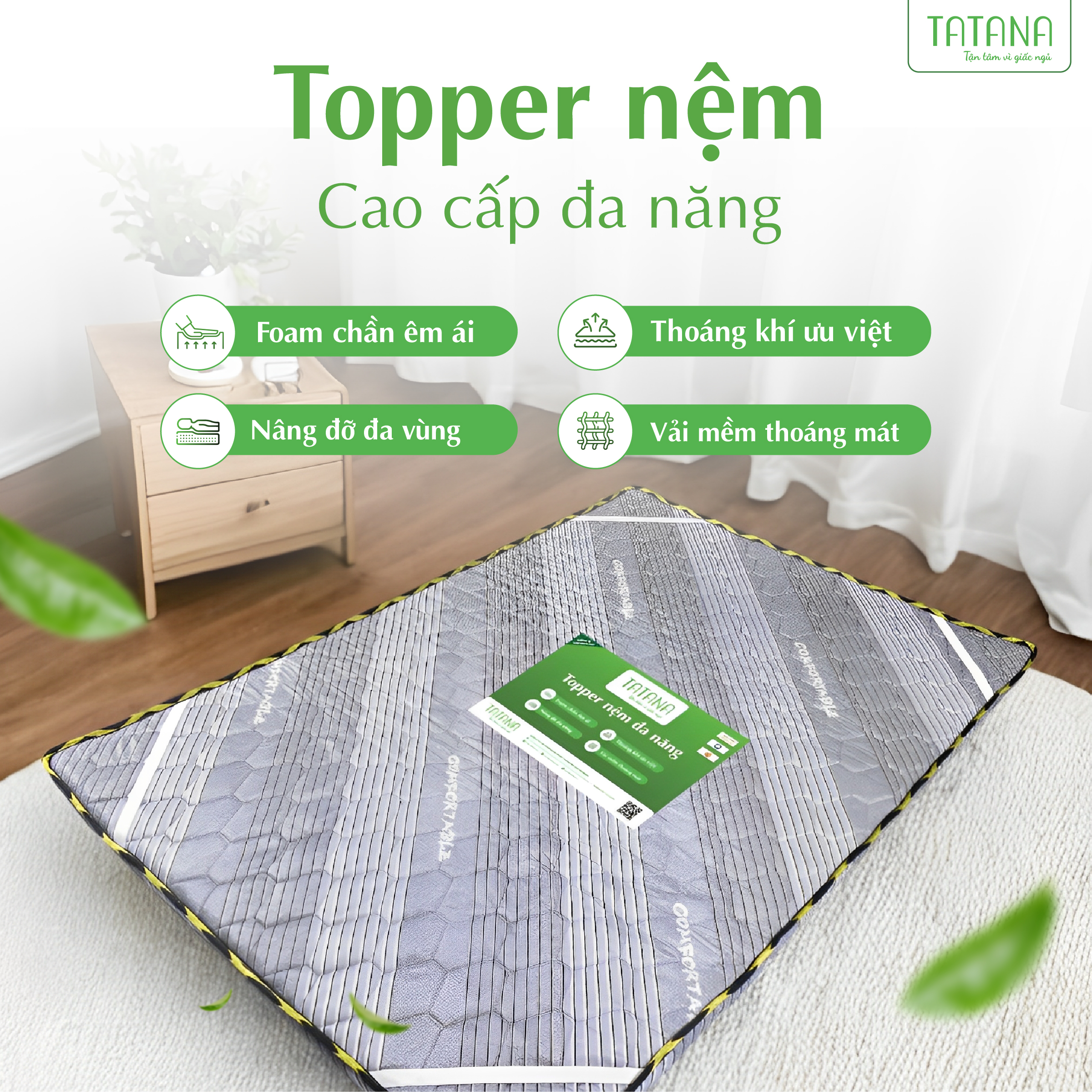 CẤU TẠO CỦA TOPPER TATANA - Vải Cotton: Topper Tatana được sản xuất theo quy chuẩn độ phồng 5cm, đây là dòng topper nệm cao cấp, hiện đại,phù hợp với nhu cầu sống hiện đại.