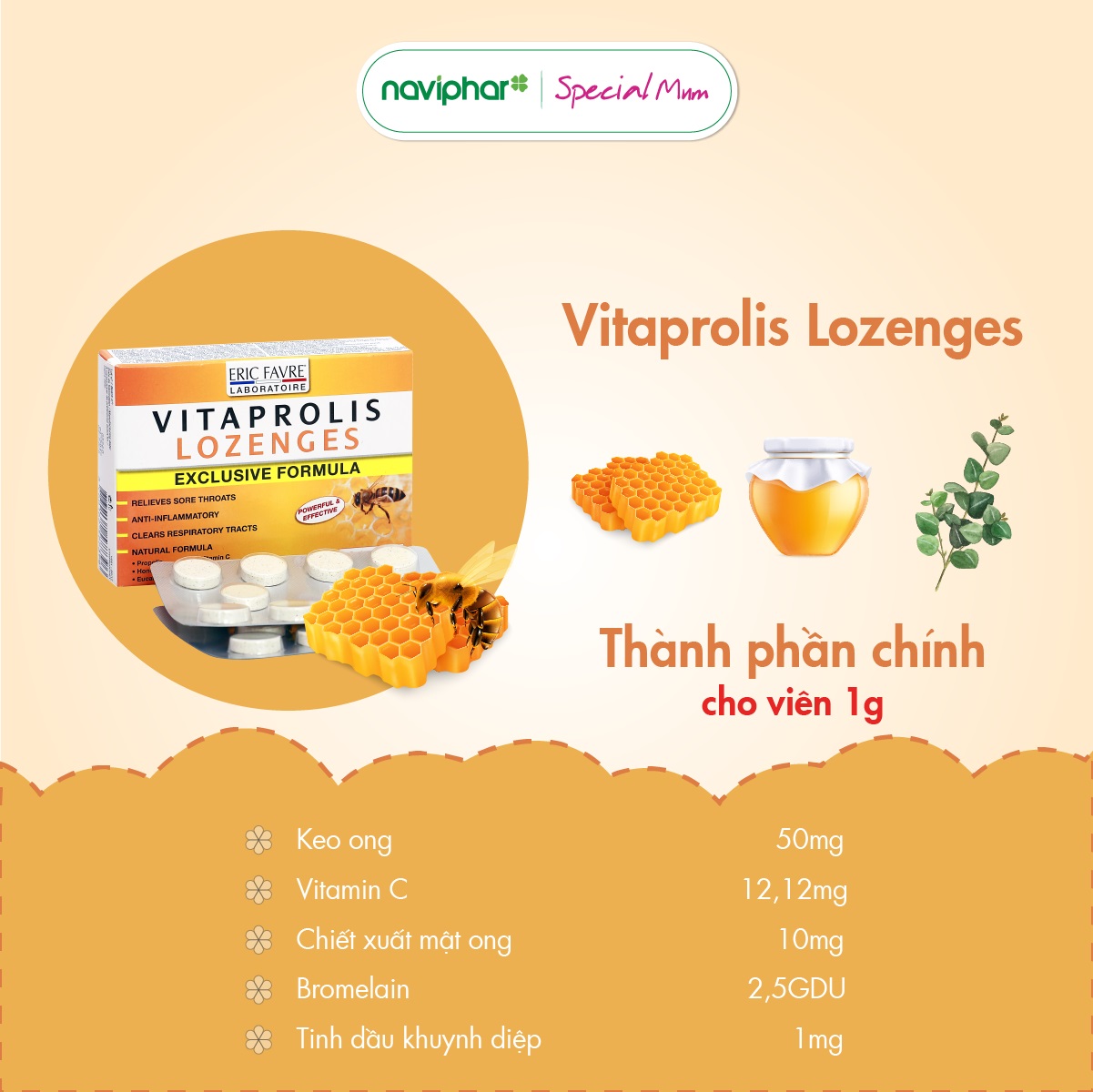 Vitaprolis Lozenges là viên ngậm ho từ tự nhiên được nhập khẩu nguyên hộp từ tập đoàn ERIC FAVRE – PHÁP danh tiếng. Vitaprolis Lozenges - viên ngậm ho cho cả gia đình. An toàn cho mẹ bầu, mẹ đang cho con bú