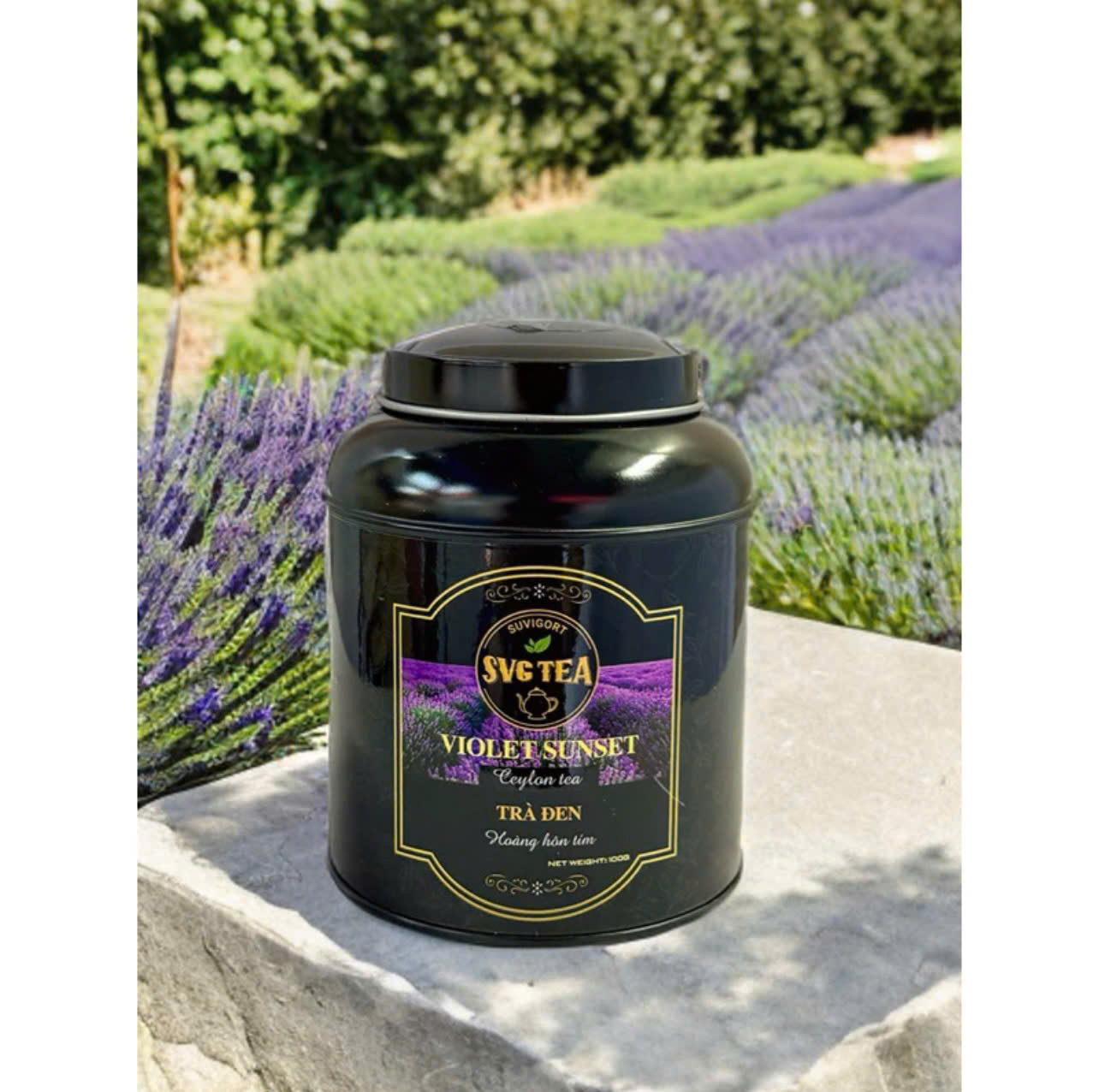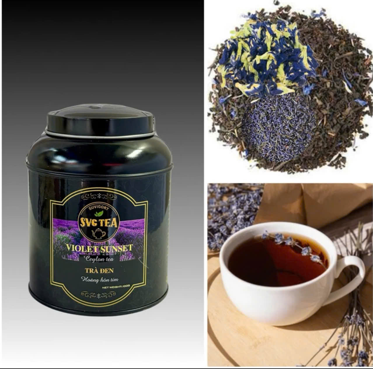 Violet Sunset Black Tea là loại trà đen Ceylon kết hợp tinh tế với hoa oải hương, hoa đậu biếc và lá bạc hà sấy tinh khiết mang đến hương vị the mát, thơm quý phái như vẻ đẹp lãng mạn của buổi chiều hoàng hôn tím trên cánh đồng hoa oải hương. Trà được trồng và thu hoạch trên vùng thổ nhưỡng và khí hậu tuyệt vời ở Lâm Đồng. Dùng mỗi ngày cho nhu cầu thưởng trà tao nhã của bạn!