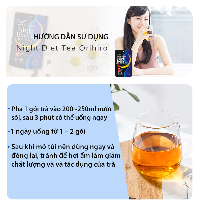 Trà ORIHIRO Night diet tea nhập khẩu nhật bản THÔNG TIN SẢN PHẨM Trà được coi như một thức uống rất lành và có tác dụng tốt cho sức khỏe. Và còn gì tuyệt vời