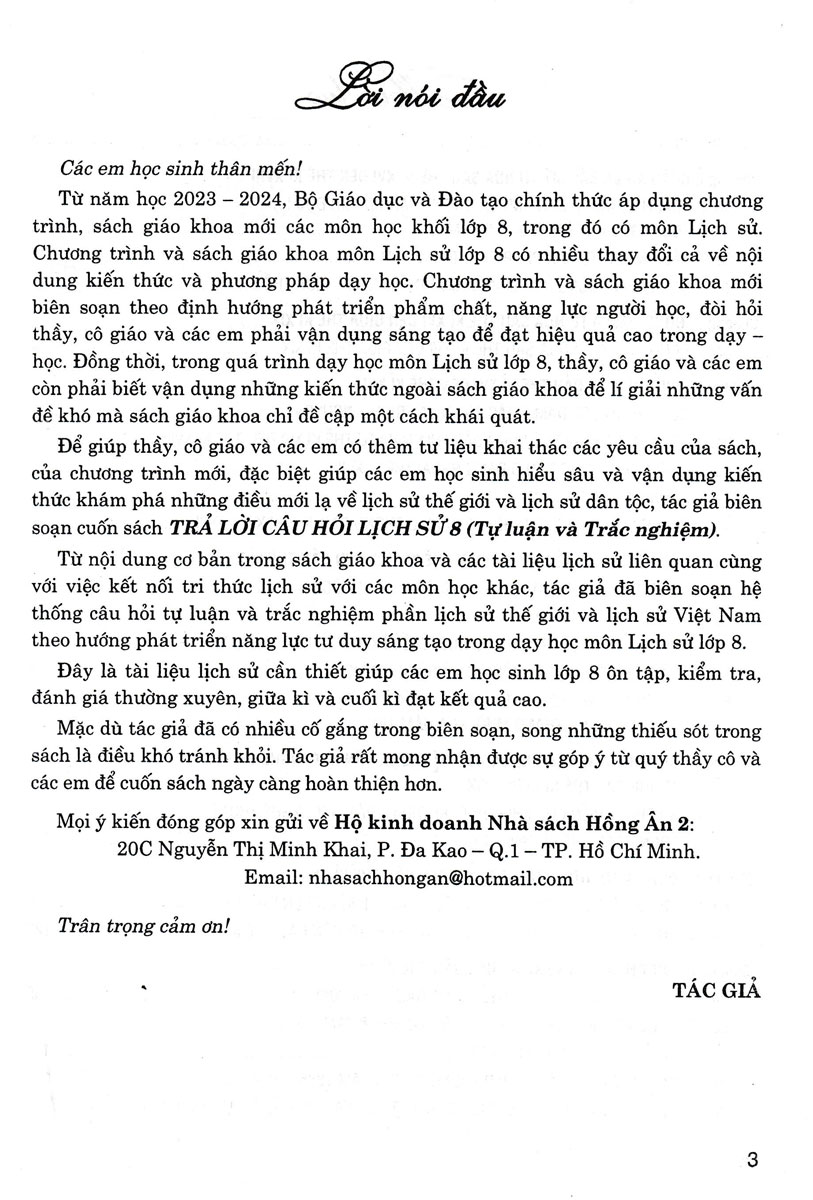 Để giúp thầy, cô giáo và các em có thêm tư liệu khai thác các yêu cầu của sách, của chương trình mới, đặc biệt giúp các em học sinh hiểu sâu và vận dụng kiến thức khám phá những điều mới lạ về lịch sử thế giới và lịch sử dân tộc, tác giả biên soạn cuốn sách TRẢ LỜI CÂU HỎI LỊCH SỬ 8 (Tự luận và Trắc nghiệm).