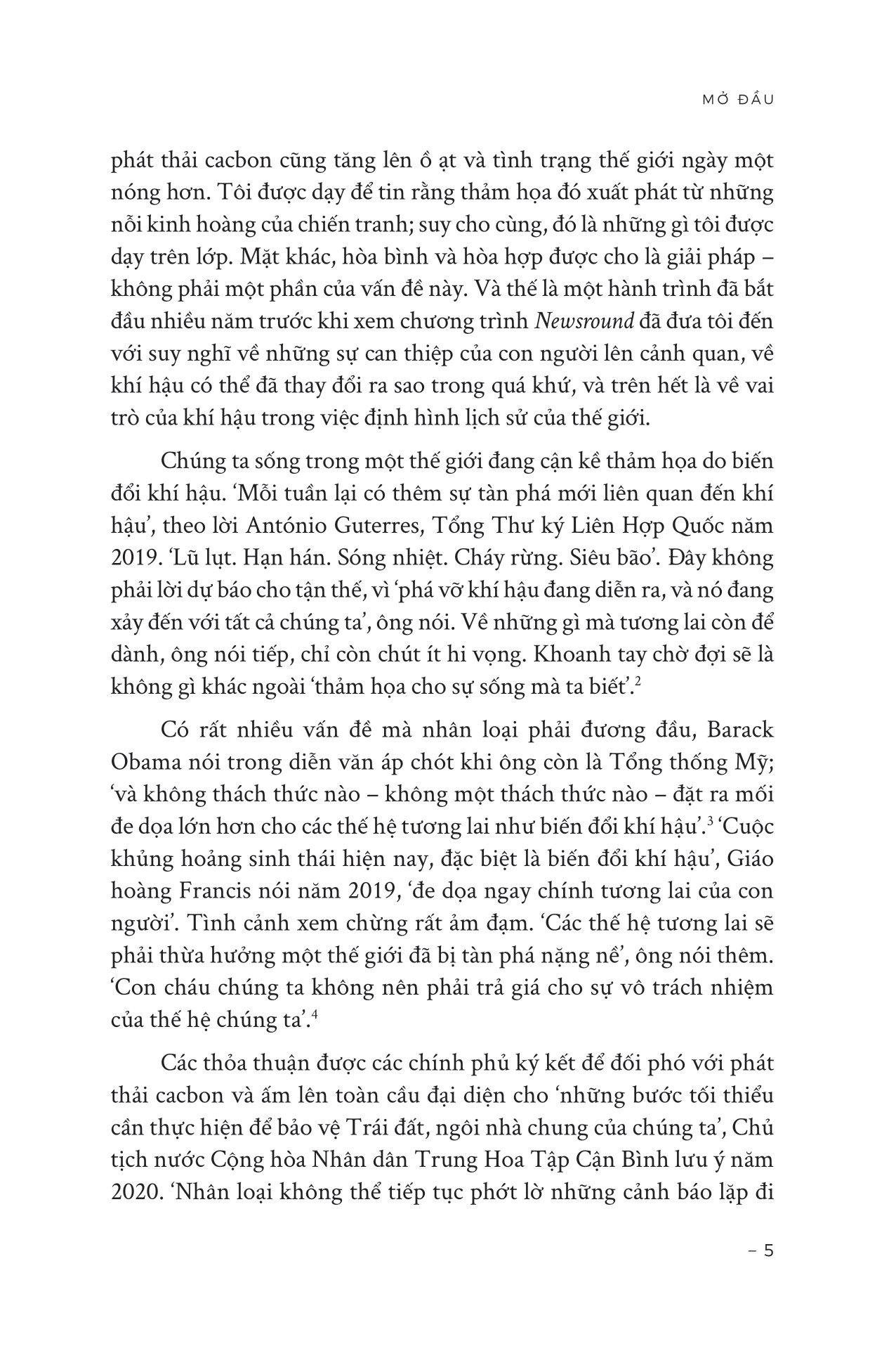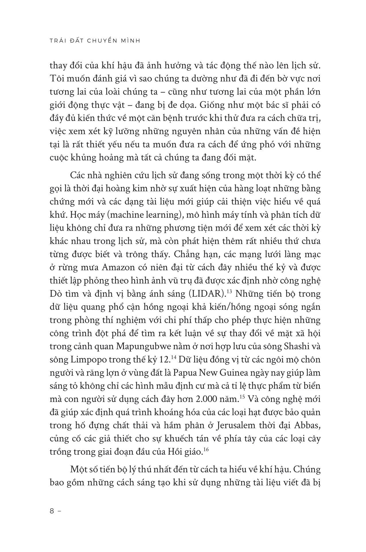 - Cuốn sách này không nói về những gì sẽ diễn ra trong tương lai. Mục đích của nó không phải để thách thức những tiếng nói đồng thanh mang tính áp đảo của cộng đồng khoa học, cũng không tập trung vào các điều kiện toàn cầu hiện tại hay xem xét những bước đi nào có thể giảm thiểu một số hoặc thậm chí là nhiều vấn đề tồi tệ nhất do biến đổi khí hậu đặt ra, dẫu là qua sự thích nghi hay giới thiệu những công nghệ mới. Thay vào đó, mục đích của nó là xem xét quá khứ, hiểu và giải thích chúng ta đã ở vào vị thế mà nay có vẻ thật hiểm nghèo như thế nào. Ban đầu, tôi nghĩ m.ình sẽ chỉ viết về lịch sử, rằng khí hậu đã định hình thế giới quanh ta như thế nào, và về những chiều hướng mà những biến chuyển trong nhiệt độ toàn cầu, lượng mưa và mực nước biển – cùng những hiện tượng cực đoan, như siêu bão, núi lửa phun trào và va chạm thiên thạch – đã ảnh hưởng lên quá khứ, sắp đặt nên những khoảnh khắc, những thời kỳ và bối cảnh giải thích vai trò quan trọng đến nhường nào của khí hậu trong lịch sử thế giới. Tuy nhiên, mọi sự rất sớm rõ ràng khi tôi bắt đầu nghĩ về một cuốn sách sẽ mở ra cánh cửa với khí hậu, với những thay đổi trong các kiểu quy luật thời tiết và với tác động của con người lên thế giới tự nhiên, nó sẽ dẫn tới một loạt câu hỏi và thách thức lớn hơn rất nhiều về mối quan hệ giữa dư thừa nông nghiệp và sự ra đời của nhà nước quan liêu; về mối liên quan giữa một bên là những người mục súc, du mục và bên kia là xã hội định canh định cư trong những ngôi làng, thị trấn và thành phố; về vai trò và sự phát triển của tôn giáo và các hệ thống tín ngưỡng như một hàm số của khí hậu, môi trường và địa lý; về c.hủng tộc và chế độ nô lệ, và vai trò của chúng trong quá trình khai thác các tài nguyên; về sự mở rộng của lương thực, mầm bệnh và bệnh tật; về chế độ dân chủ, nghèo đói và các mô hình tiêu thụ trong nhiều thế kỷ kể từ cách mạng công nghiệp; về toàn cầu hóa, tiêu chuẩn hóa của công nghiệp, nông nghiệp, lương thực và thời trang trong thế kỷ gần đây nhất; về nguyên do thế kỷ 21 rơi vào thời khắc khủng hoảng. Do đó cuốn sách này có ba mục đích. Thứ nhất là đưa khí hậu vào trong câu chuyện của quá khứ như một chủ đề cơ sở, mang tính cốt yếu và hay bị bỏ qua trong lịch sử toàn cầu, từ đó cho thấy ở đâu, khi nào và như thế nào mà thời tiết, các mô hình khí hậu kéo dài và những thay đổi trong khí hậu – do con người và do các nguyên nhân khác – lại có tác động to lớn đến thế giới. Thứ hai là trình bày câu chuyện về tác động của con người với thế giới tự nhiên qua nhiều thiên niên kỷ và xem xét cách thức loài người chúng ta khai thác, nhào nặn và uốn nắn môi trường theo ý chí của m.ình, cả mặt tốt lẫn mặt xấu. Và thứ ba là mở rộng tầm nhìn của chúng ta về lịch sử. Nghiên cứu về quá khứ từng bị thống trị bởi sự chú ý dành cho ‘thế giới phương bắc’, là những xã hội giàu có của châu Âu và Bắc Mỹ, còn lịch sử của các châu lục và khu vực khác thường bị xếp vào mức độ quan trọng thứ yếu hoặc bỏ qua hoàn toàn. Chính kiểu mẫu này cũng được áp dụng cho khoa học khí hậu và nghiên cứu về lịch sử khí hậu, nơi những khu vực rộng lớn, giai đoạn và con người nhận được ít sự chú ý, nghiên cứu hay đầu tư – nó nói lên nhiều điều về những quan điểm đã được chấp nhận từ lâu về quá khứ cũng như thực tế phát triển và hoạt động đào sâu vào thực tiễn của các quỹ học thuật (và các trung tâm trí thức). Nếu những điểm trên hướng đến một lý do căn bản để đánh giá lại lịch sử, thì sự nhấn mạnh quá mức của các sử gia rằng các thị trấn, thành phố và quốc gia giống nhau về sự lãnh đạo, bộ máy quan liêu và hành vi cũng cần như vậy. Thực vậy, bản thân từ ‘nền văn minh’ về nghĩa đen để chỉ đời sống của các thành phố, của những người sống trong nó và người phóng chiếu quyền lực và cai trị nó. Điều này được phản ánh trong hầu hết các tư liệu viết mang tính lịch sử – các bài tường thuật, các ghi chép về bán đất, các hóa đơn thuế, – phục vụ cho việc củng cố sự cai trị theo tôn ti thứ bậc. Rất nhiều nội dung lịch sử được viết bởi những người sống ở các thành phố, cho những người sống ở thành phố, và tập trung vào đời sống của những người sống ở thành phố. Việc đó làm lệch đi cách ta xem xét quá khứ và thế giới quanh m.ình. - Trích trang 28