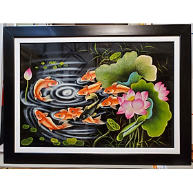 Tranh vẽ sơn mài – CỬU NGƯ QUẦN TỤ -CÁ CHÉP HOA SEN Chất liệu sơn mài trên gỗ,dày 1cm thếp vàng, bạc, vỏ trứng cực tinh xảo Khung vân gỗ nghệ thuật, chất liệu