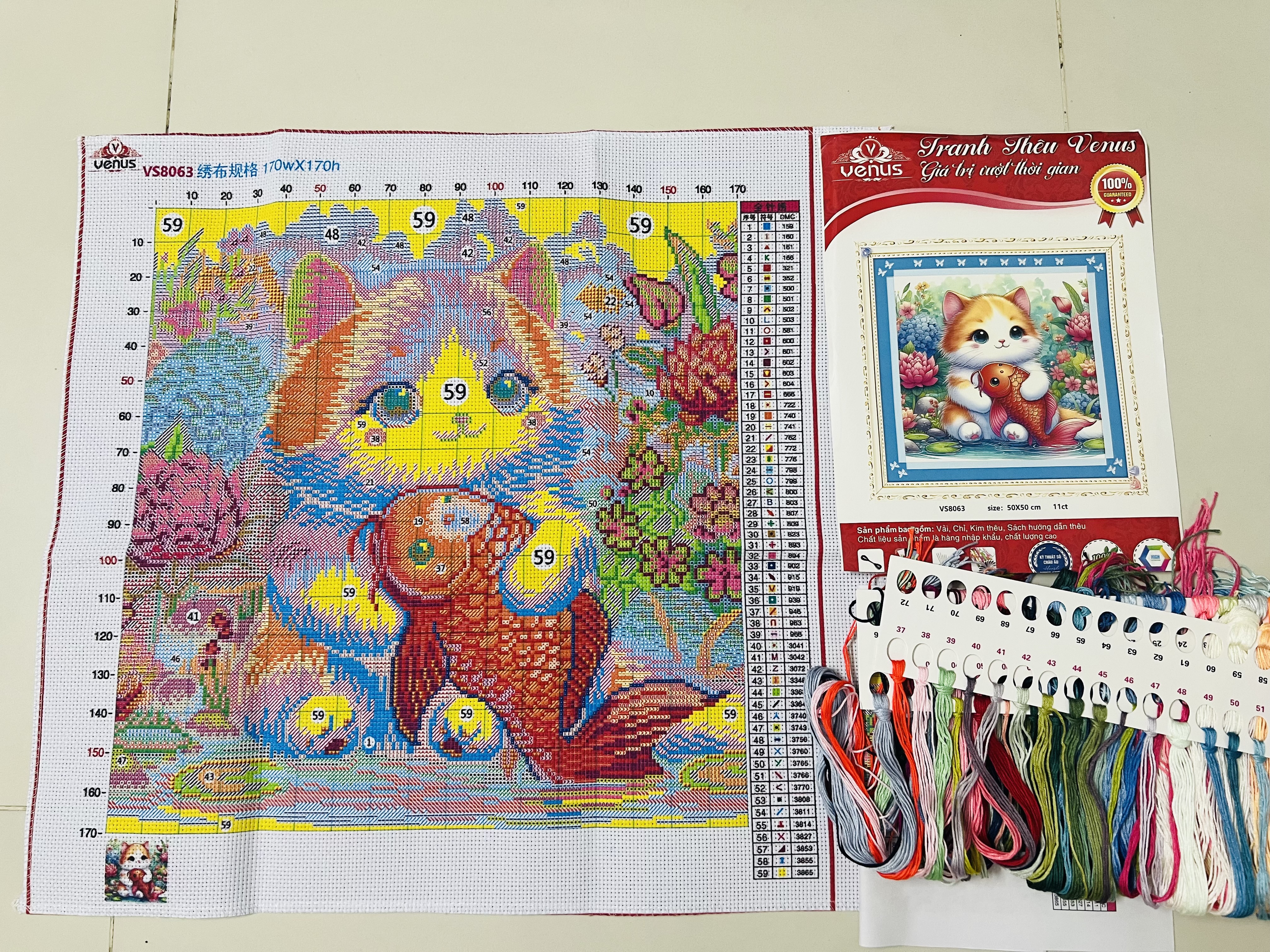 ✨Tranh thêu chữ thập Mèo ôm cá vs8063, kích thước 50 x 50 cm