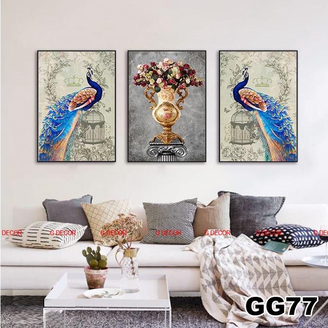Tranh in trên vải canvas hội họa Kích thước: 40x60cm x3 Tấm lưng bằng gỗ MDF nhập khẩu. Khung vật liệu composite. Không bị ảnh hưởng bởi nước, ẩm mốc. Tặng kèm đinh 3 chân