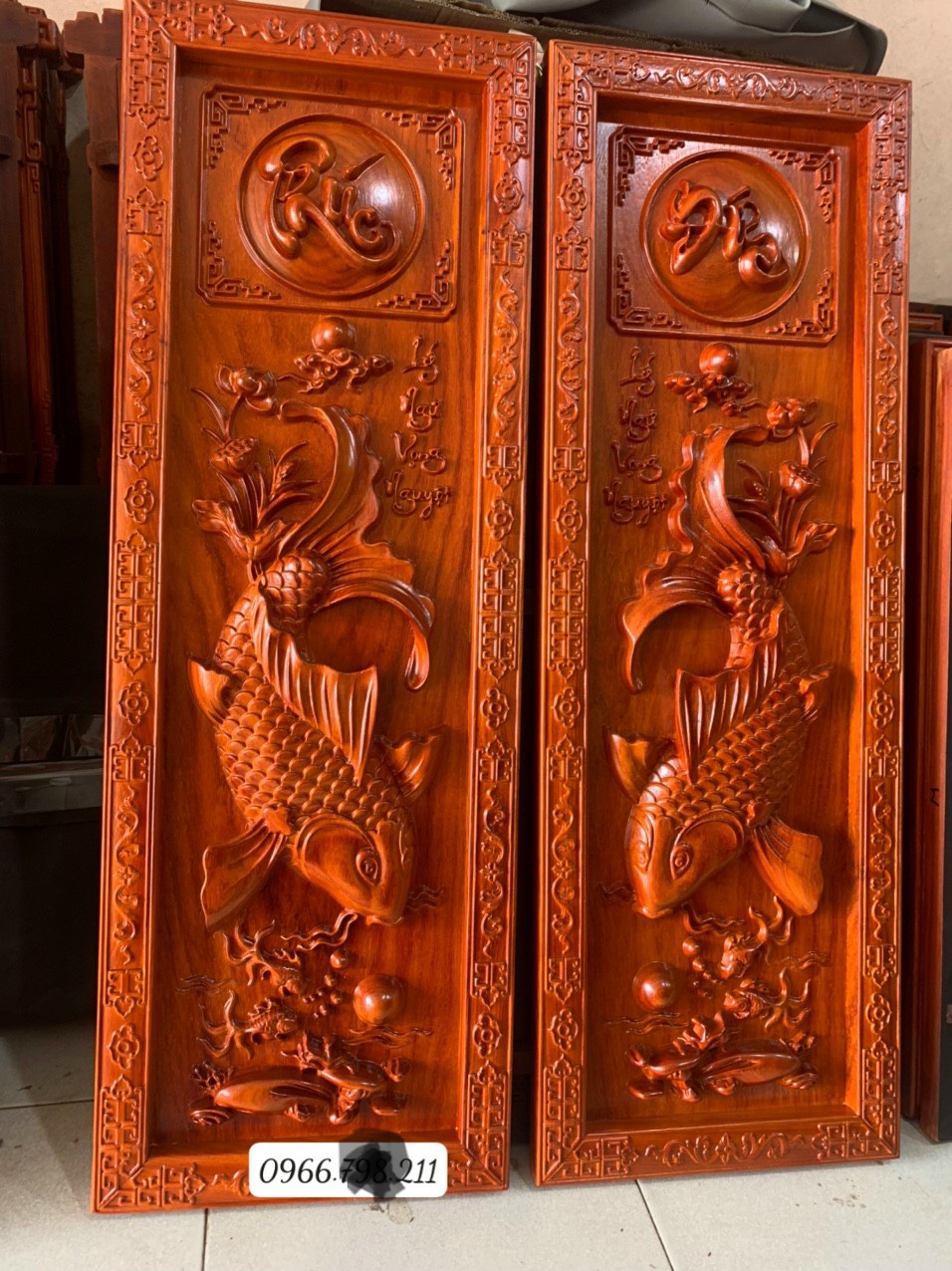 Cặp Tranh Cá gỗ hương đỏ - tranh Lý Ngư Vọng Nguyệt. 0986039040