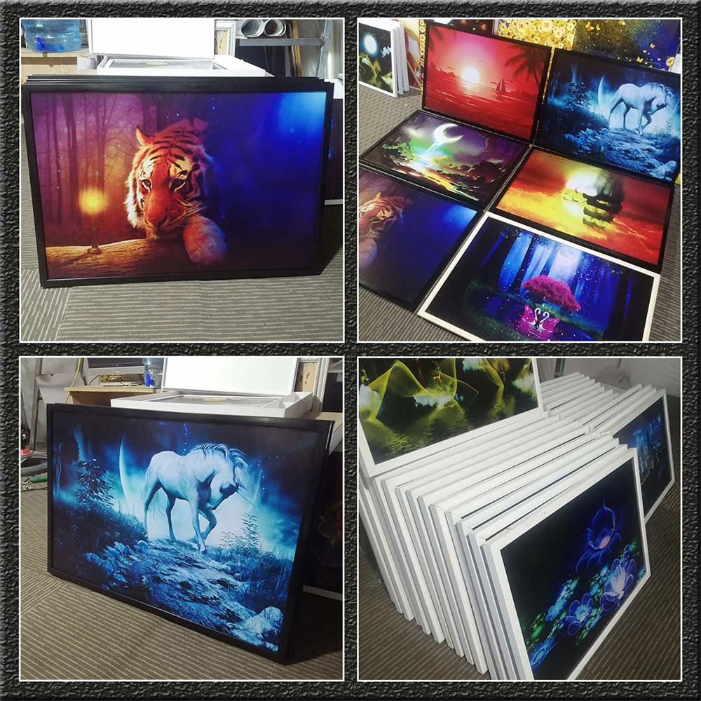 - Bề mặt tranh được bảo vệ với 2 lựa chọn chất liệu là pvc gương hoặc cán lụa kim sa ánh kim. Cho hình ảnh có chiều sâu 3D, chống trầy sước, bám bụ