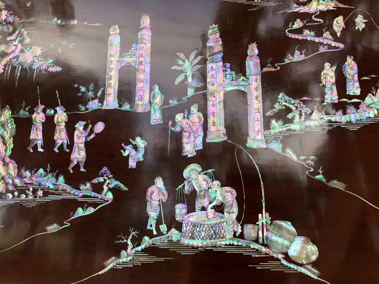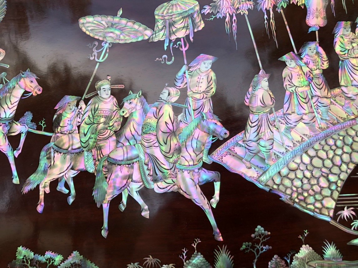 _ Tranh vinh quy bái tổ được cắt tỉa từng chi tiết xà cừ ốc đỏ ,lặp ghép vào với nhau vô cùng công phu, tinh sảo ,kỳ công .Đi hầu hết tất cả mọi đường nét đều được gọt tỉa chỉnh sửa hoàn toàn bằng tay thủ công .Đồng thời ván tấm gỗ gụ được kiểm định kỹ lưỡng như cho vào tắm nước vôi ,rồi cho vào sấy gỗ khô kiệt ,Mục đích trống dập nứt vênh mo ,mối mọt ,Kết hợp với trà nhám đánh ,giấy giáp nhiều lần ,sờ mát lạnh ,song rồi nhuộm mầu mận chín đánh vétly làm mầu mận chín giả cổ ,Tranh vinh quy được làm và hoàn thiện do bàn tay khối óc tài hoa ,Từ những người thợ giàu kinh nghiệm ,cũng như các nghệ nhân có tay nghề cao trong làng nghề truyền thống .Chính vì thế tranh vinh quy bái tổ đã đáp ứng đầy đủ những tiêu trí ( Đẹp bền rẻ ) Thẩm mỹ nghệ thuật với chất lượng hoàn hảo