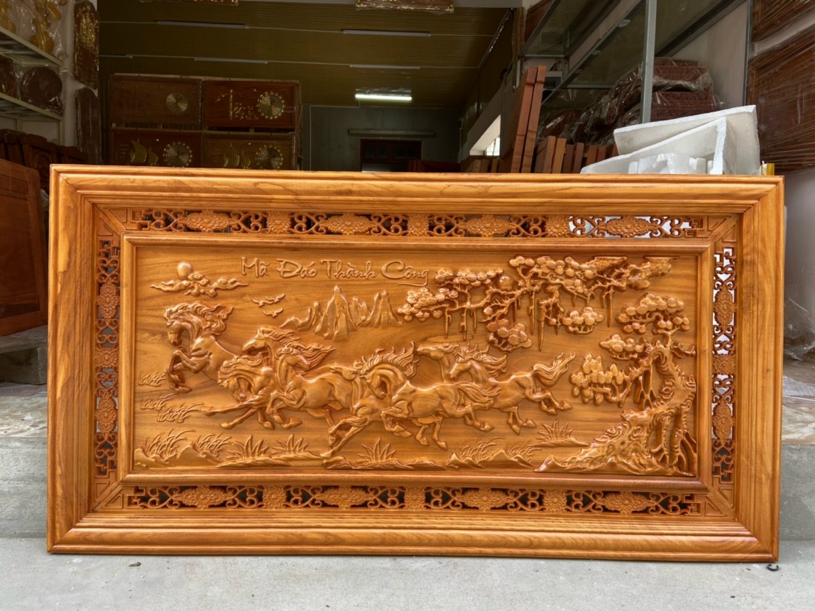 Tranh gỗ mã đáo thành công khung đục 1.27m
