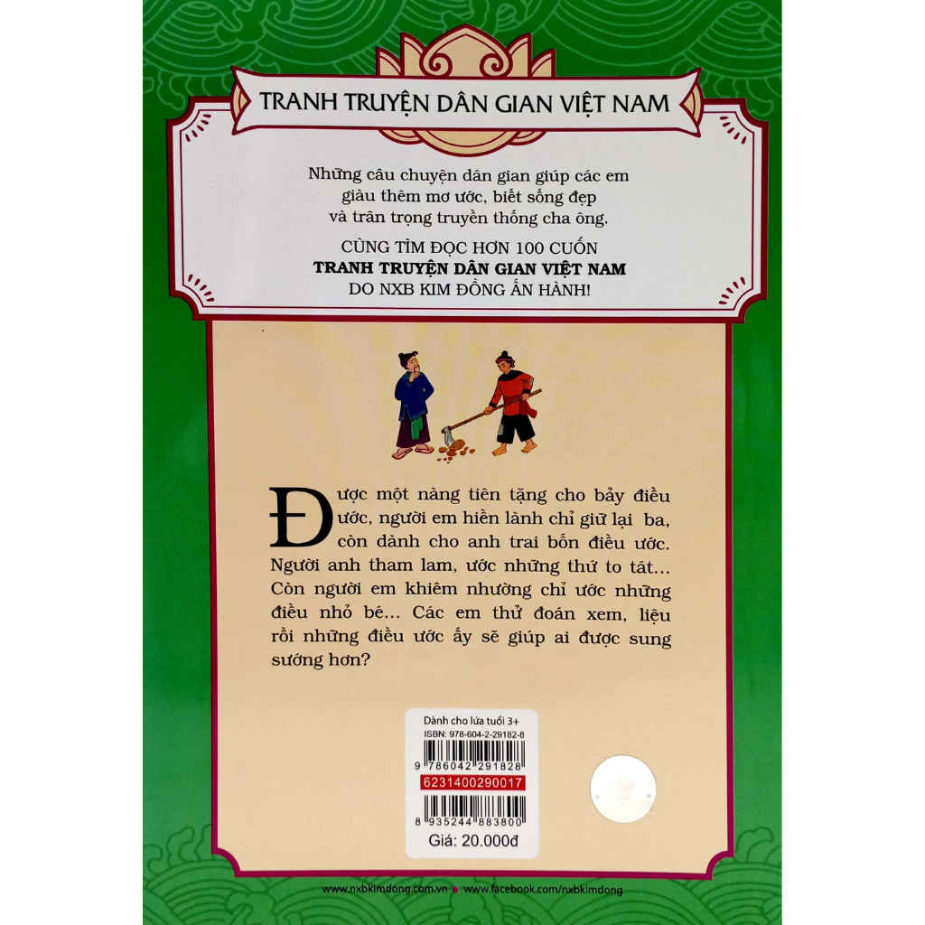 Mua tại TiktokTóm tắt nội dung Được một nàng tiên tặng cho bảy điều ước, người em hiền lành chỉ giữa lại ba, còn dành cho anh trai bốn điều ước. Người anh tham lam, ước những thứ to tát… Còn người em khiêm nhường chỉ ước những điều nhỏ bé… các em thử đoán xem, liệu rồi những điều ước ấy sẽ giúp ai được sung sướng hơn?