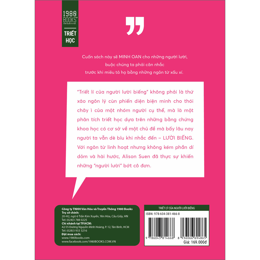 “Đừng lười biếng nữa!” Chắc hẳn đôi lúc bạn sẽ nghe ba mẹ nói vậy khi đang mải mê đắm chìm trong trò chơi nào đó. Hoặc cũng có thể bạn sẽ nghe được những lời này từ một người bạn cùng phòng khi bản thân đang nằm dài trên ghế sô pha, tay cầm điện thoại lướt Instagram. Hoặc đơn giản đây là lời bạn tự nhủ với chính mình vào những ngày bạn chẳng làm gì. Nhưng lười biếng có gì xấu đến vậy? Chẳng lẽ lúc nào bạn cũng phải thể hiện mình là người hữu dụng sao? Trái ngược lại với văn hóa phát huy hết hiệu suất làm việc của chúng ta, Alison Suen cảm thấy thật nực cười khi chúng ta luôn chỉ trích kẻ lười biếng – những cá nhân chỉ làm cho qua chuyện để được yên thân. Bà đưa ra phân loại những kiểu chỉ trích người lười biếng thường thấy, và biện luận rằng những đánh giá trên sai, hoặc là tiền đề của những đánh giá đó có vấn đề. Tuy cuốn sách này bào chữa cho sự lười biếng, nhưng nó không hề bênh vực lối sống lười biếng và nâng tầm nó lên thành chìa khóa hướng đến điều gì đó tốt đẹp hơn (như bước tiến mới của văn hóa hay sự tự giác ngộ bản thân gì đó), như một vài học giả vẫn nói. Trên thực tế, Suen chỉ đề cập đến việc lười biếng thể hiện độc đáo vì nó chẳng phục vụ mục đích cao cả nào. Và đây hoàn toàn không phải là sự phản đối có toan tính đối với những bất công trong xã hội, cũng chẳng phải con đường đi đến tự do ý chí nào cả. Người lười biếng chẳng qua chỉ lười biếng mà thôi. Bằng việc nghiên cứu văn hóa phát huy hiệu suất làm việc, Suen đã nhận định một thực tế rằng đôi khi lười biếng không hề xấu, vậy thôi. Trong cuốn sách này sẽ MINH OAN cho những người lười, buộc chúng ta phải cân nhắc trước khi miêu tả họ bằng những ngôn từ xấu xí. “Triết lí của người lười biếng” không phải là thứ xảo ngôn lý cùn phiến diện biện minh cho thói chây ì của một nhóm người cụ thể, mà là một phân tích triết học dựa trên những bằng chứng khoa học có cơ sở về một chủ đề mà bấy lâu nay người ta vẫn dè bỉu khi nhắc đến – LƯỜI BIẾNG. Với ngôn từ linh hoạt nhưng không kém phần dí dỏm và hài hước, Alison Suen đã thực sự khiến những “người lười” bớt cô đơn.