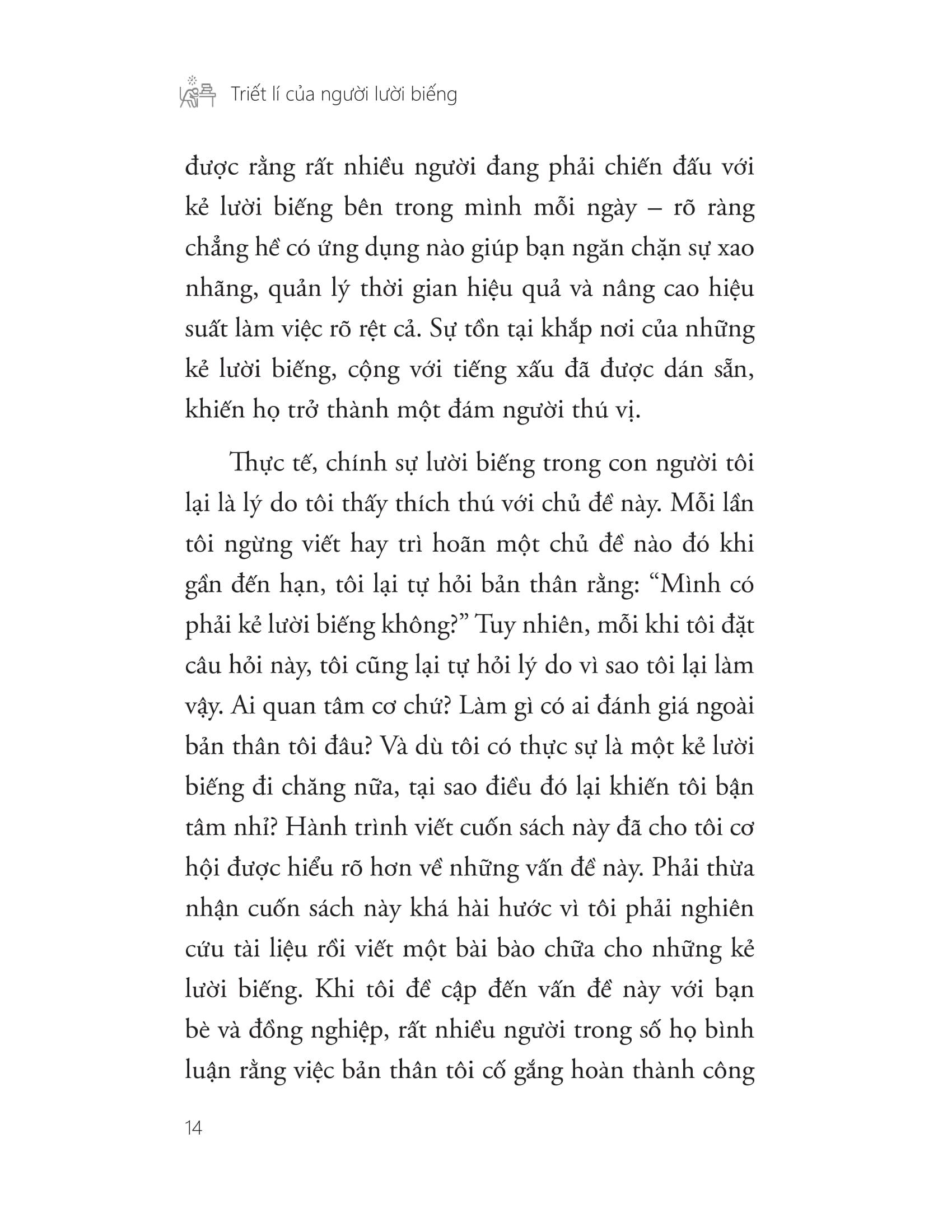 “Triết lí của người lười biếng” không phải là thứ xảo ngôn lý cùn phiến diện biện minh cho thói chây ì của một nhóm người cụ thể, mà là một phân tích triết học dựa trên những bằng chứng khoa học có cơ sở về một chủ đề mà bấy lâu nay người ta vẫn dè bỉu khi nhắc đến – LƯỜI BIẾNG. Với ngôn từ linh hoạt nhưng không kém phần dí dỏm và hài hước, Alison Suen đã thực sự khiến những “người lười” bớt cô đơn.