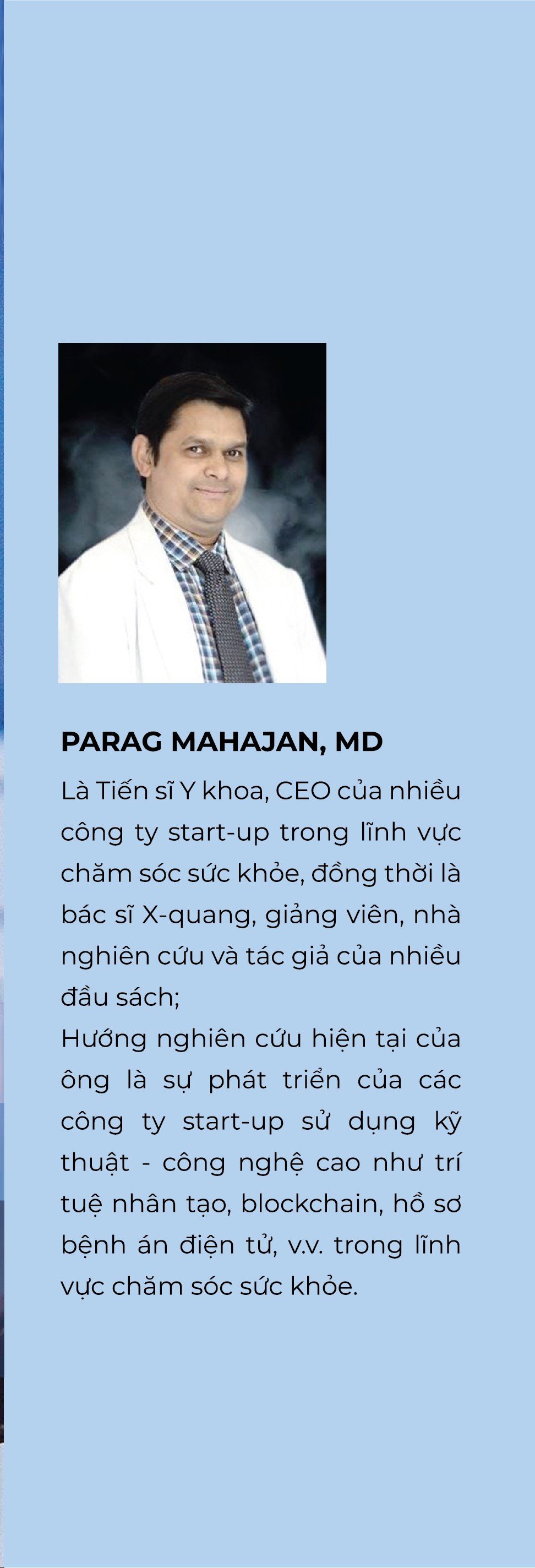 PARAG MAHAJAN, MD - Là Tiến sĩ Y khoa, CEO của nhiều công ty start-up trong lĩnh vực chăm sóc sức khỏe, đồng thời là bác sĩ X-quang, giảng viên, nhà nghiên cứu và tác giả của nhiều đầu sách;