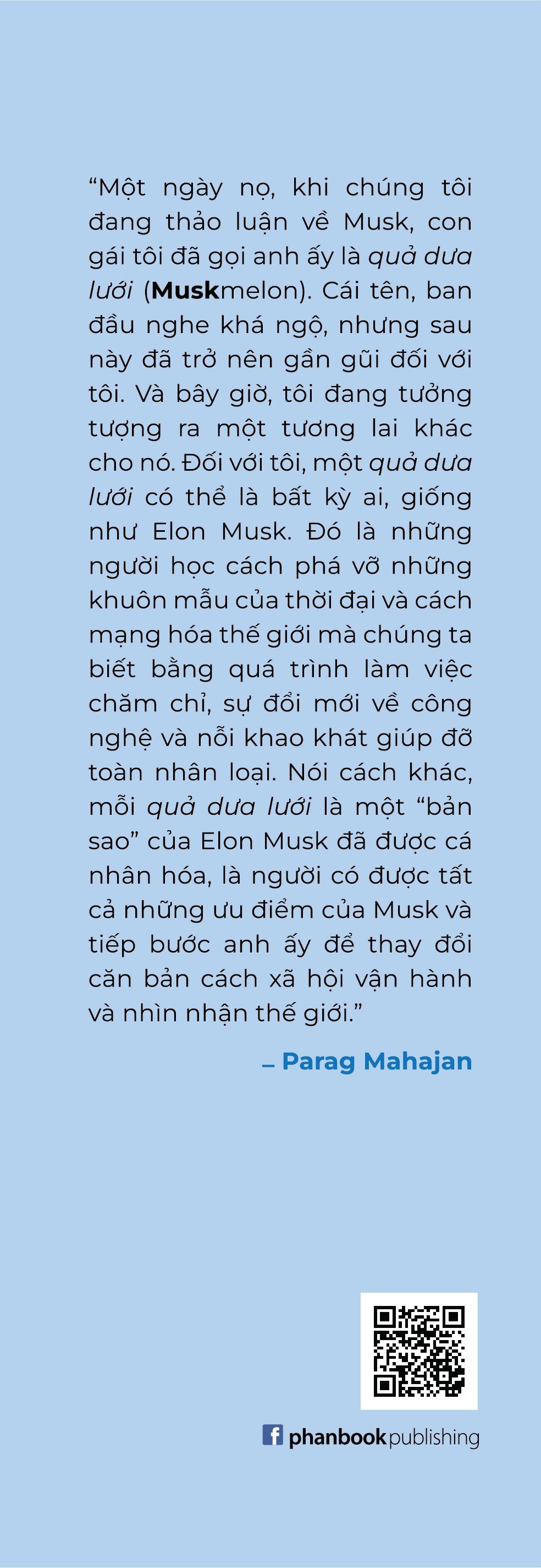 Từ PayPal đến SpaceX, Elon Musk liên tục hình dung lại thế giới mà chúng ta đang sống. Anh gần như đóng vai trò quyết định cho tương lai của nhân loại. Với vô số thành tựu đã được đề cập trong những cuốn sách viết về Musk, chúng ta khó tìm được điều gì khác để miêu tả về người đàn ông giàu nhất thế giới này ngoài sự thành công tột bậc