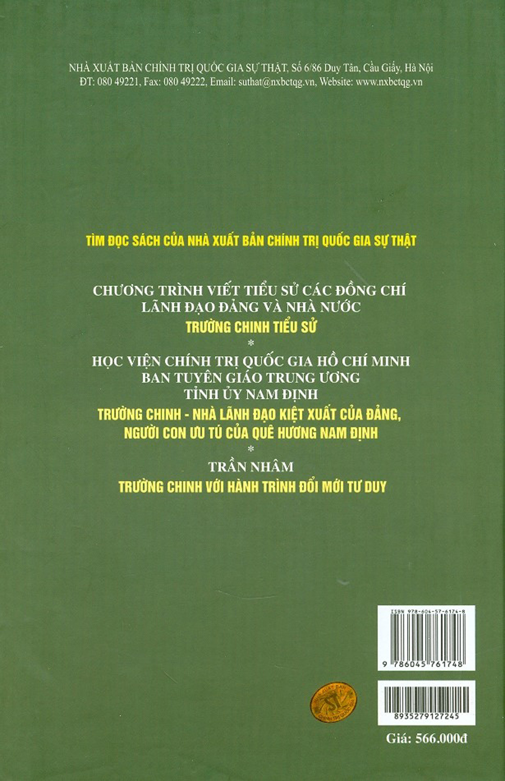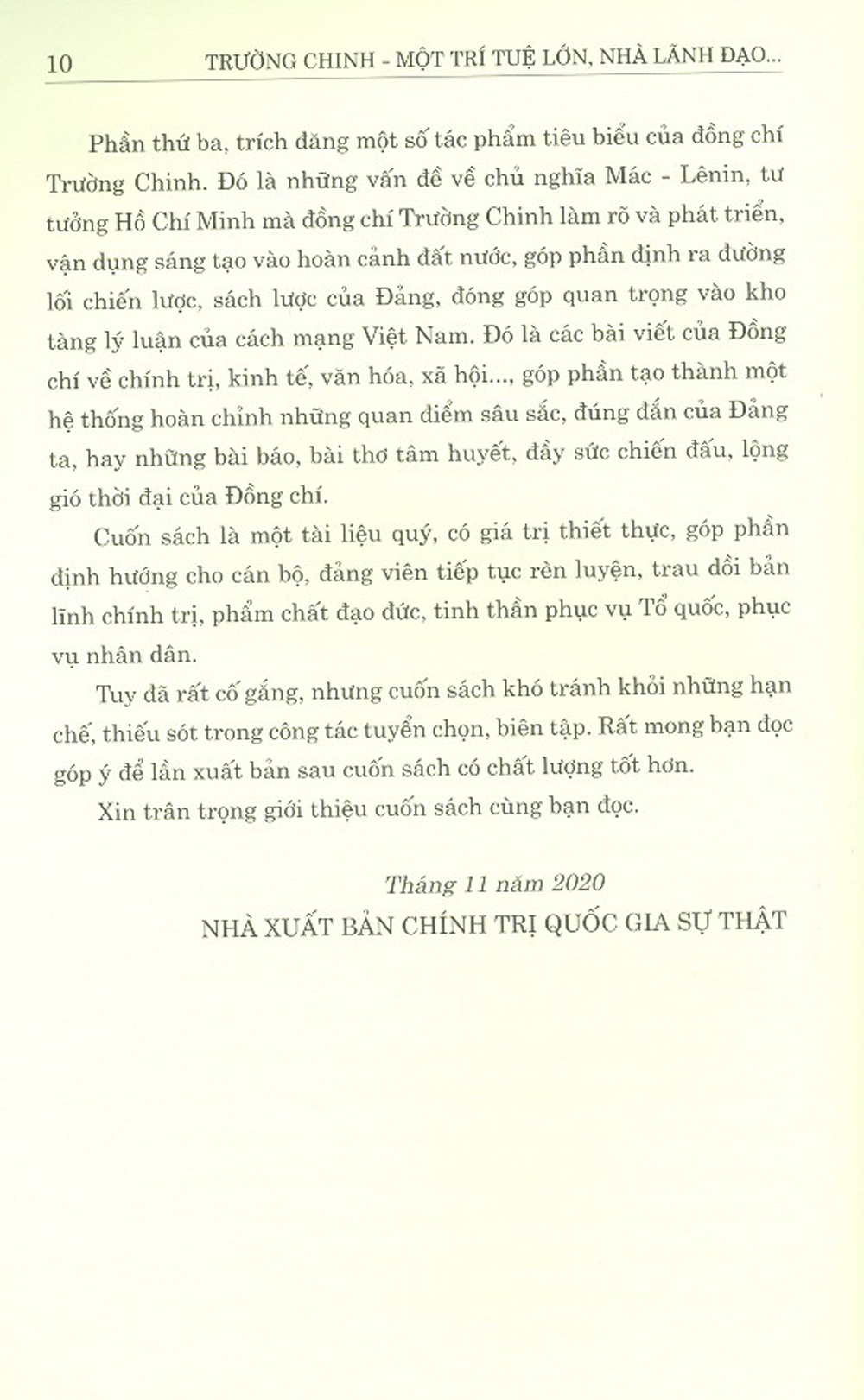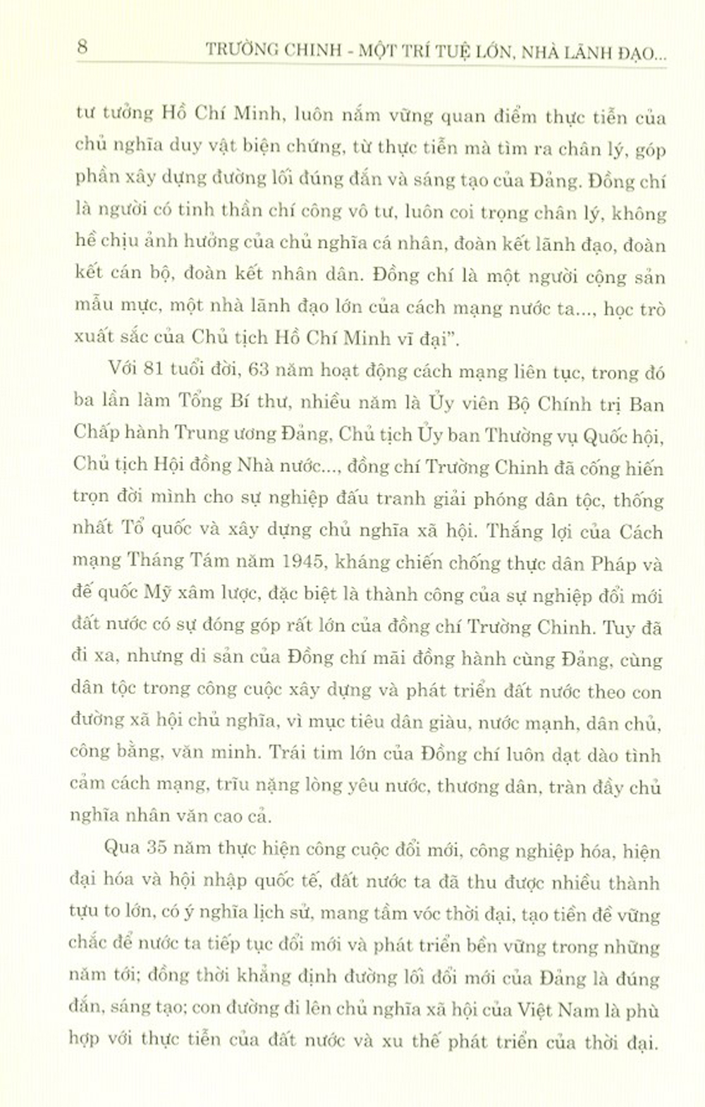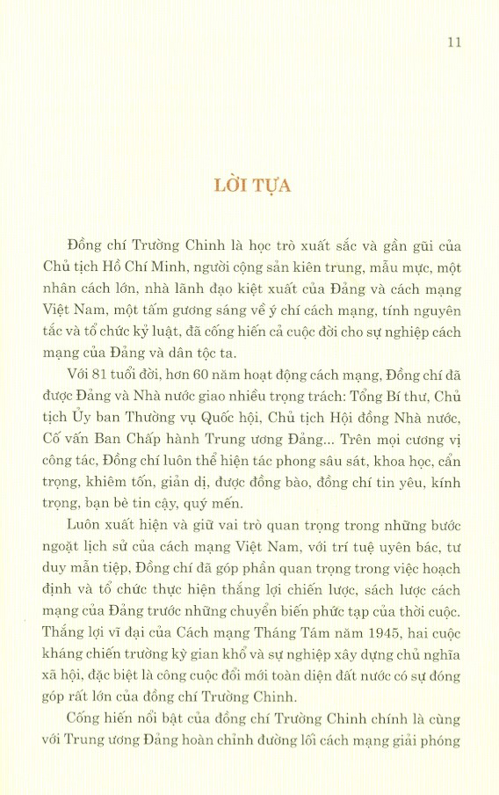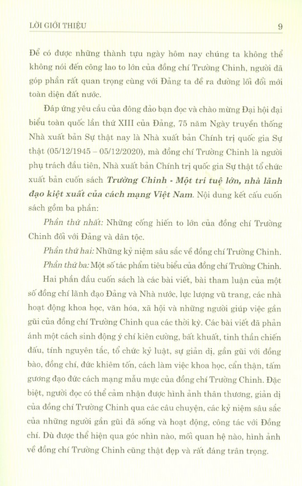 Mua tại TiktokSách tập hợp các bài viết của các đồng chí lãnh đạo Đảng và Nhà nước, các nhà hoạt động khoa học, văn hóa, xã hội và những người làm việc gần gũi với đồng chí Trường Chinh qua các thời kỳ về những cống hiến to lớn của đồng chí Trường Chinh đối với Đảng và dân tộc; những kỷ niệm sâu sắc về đồng chí Trường Chinh; một số tác phẩm tiêu biểu của đồng chí.
