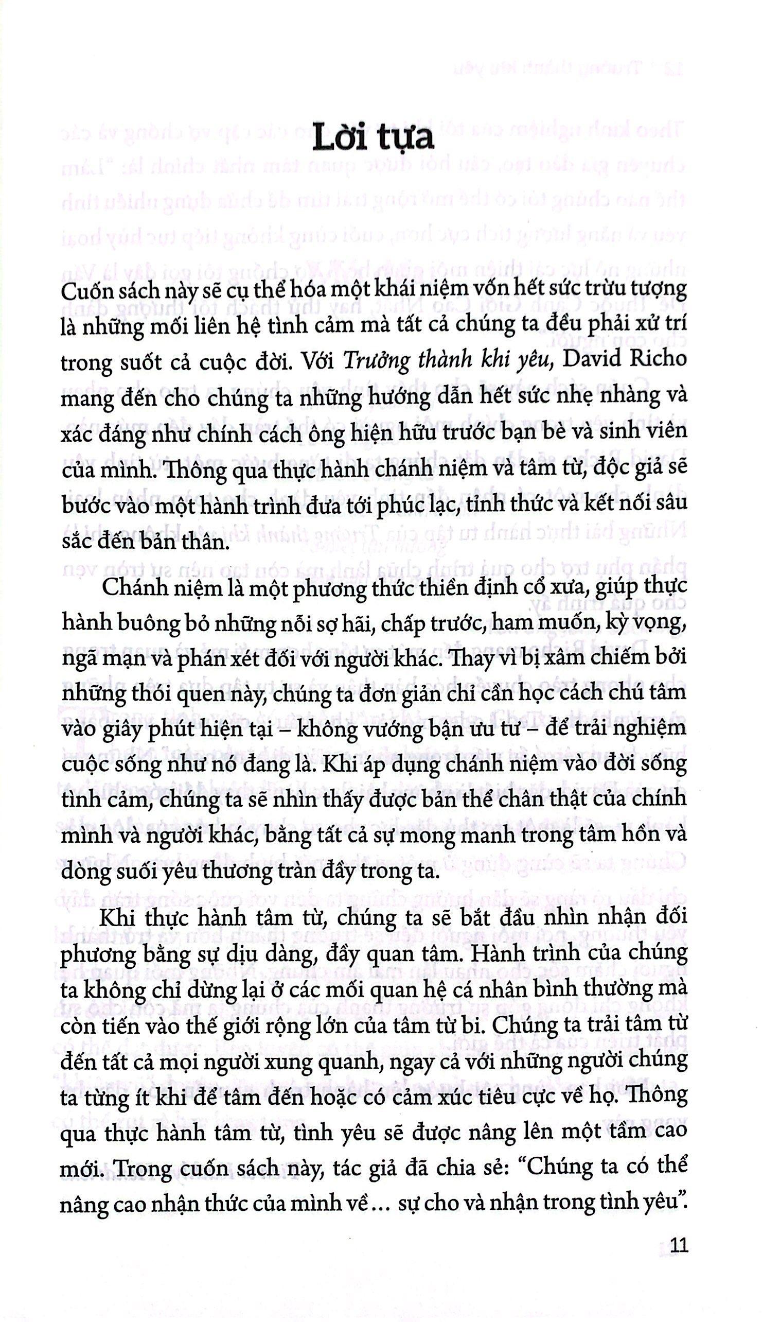 Trưởng Thành Khi Yêu Trưởng thành khi yêu cùng độc giả khám phá năm đặc tính của một tình yêu tỉnh thức và vai trò quan trọng của chúng trong các mối quan hệ. Nền tảng của một tình yêu trưởng thành chính là sự cam kết trao cho nhau những gì tác giả gọi là “Năm Chữ A”: Attention – Quan Tâm, Acceptance – Chấp Nhận, Appreciation – Trân Trọng, Affection – Yêu Thương và Allowing – Cho Phép. Với rất nhiều bài thực hành dành cho các cặp đôi và cả người độc thân, Trưởng thành khi yêu giúp người đọc hiểu sâu và có cái nhìn tích cực về hành trình yêu thương trọn đời. Với chủ đề trọng tâm là tình yêu chánh niệm, “Trưởng thành khi yêu” sẽ dành cho độc giả - người trưởng thành; người có hứng thú với chủ đề tình cảm lứa đôi, chữa lành đứa trẻ bên trong và những tổn thương từ quá khứ; người có hiểu biết cơ bản về Phật giáo Tác giả: David Richo ngoài thực hiện những công việc của một chuyên viên trị liệu tâm lý gia đình và hôn nhân, giáo viên, nhà văn, người điều phối khóa học. Tiến sĩ tâm lý học lâm sàng David Richo còn mang một sứ mệnh cao cả khác là nghiên cứu lợi ích của chánh niệm và lòng từ bi trong công cuộc phát triển cá nhân, niềm hạnh phúc trong các mối quan hệ lứa đôi. Ông cho ra đời nhiều cuốn sách, trong đó kết hợp các quan điểm tâm lý học Carl Jung, thơ ca và thần thoại với mục đích tích hợp tâm lý với duy linh. Sách và các khóa đào tạo của ông thường tập trung vào thực hành tâm linh trong Phật giáo và Ki-tô giáo. Trích đoạn sách: ĐO LƯỜNG HẠNH PHÚC | Nếu không hạnh phúc trong một mối quan hệ, bạn có thể nghĩ đó là lỗi của đối phương. Nhưng đôi khi, đó là do bản thân bạn không tin m.ình có quyền được hạnh phúc. Hãy cùng xem những dấu hiệu của một niềm tin sai lệch như vậy dưới đây. Những điều nào đúng với bạn? Dành ra ba phút để viết ra các dấu hiệu bạn từng có. Sau đó, hãy lần ngược lại các dấu hiệu ấy và viết về cách bạn sẽ áp dụng tư duy mới.