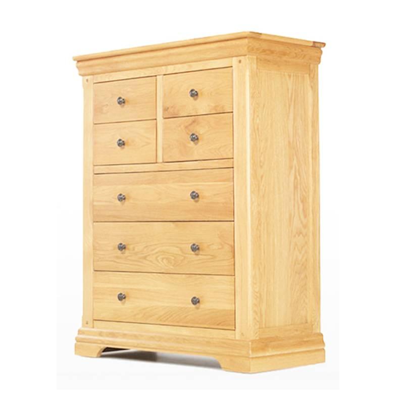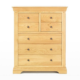 Một phòng ngủ gọn gàng sẽ giúp mọi người có những phút nghỉ ngơi thư giãn. Chiếc tủ 7 ngăn kéo kiểu Pháp cổ điển này sẽ giúp cất giữ mọi thứ ngăn nắp như quần áo, đồ dùng cá nhân…Thiết kế tuyệt đẹp với 4 hộc nhỏ bên trên và 3 ngăn kéo lớn bên dưới. Thuộc bộ sưu tập Victoria mang phong cách Pháp thế kỷ 19, đặc trưng bởi mái vòm cùng những đường cong duyên dáng. Chất liệu gỗ sồi trắng Mỹ nhập khẩu, có giá trị kinh tế cao và được chế tác hoàn toàn thủ công bởi những người thợ lành nghề. Toàn bộ bề mặt được sơn phủ PU kỹ càng, giữ nguyên được vẻ đẹp của vân gỗ, đồng thời bảo vệ lớp gỗ lâu bền trong các điều kiện khí hậu khác nhau