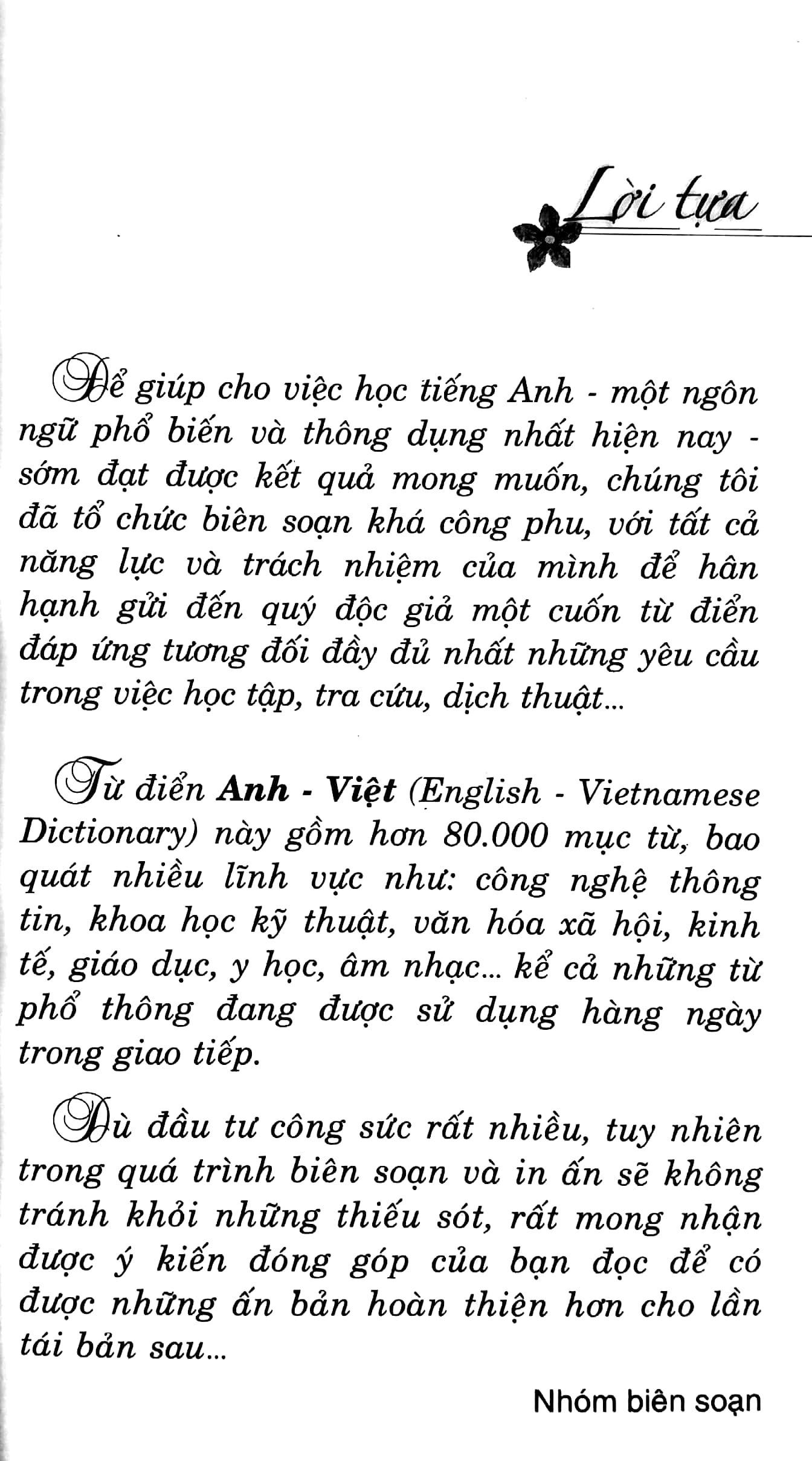 Nhằm đáp ứng nhu cầu học tiếng Anh đa dạng của nhiều người. Nhóm chúng tôi đã biên soạn cuốn từ điển Anh – Việt này để phục vụ cho người học tiếng Anh thuộc