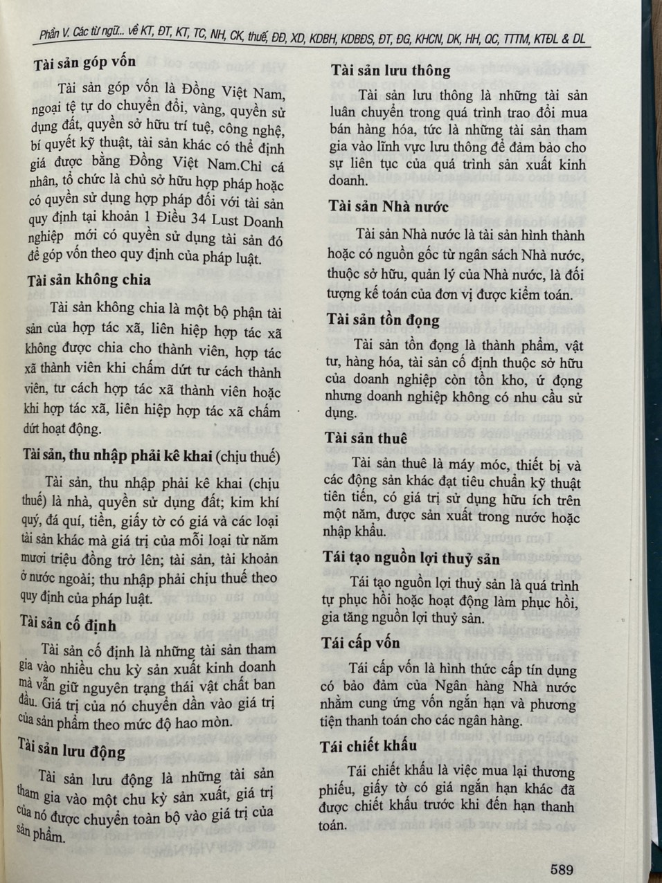 Phần V: Các từ ngữ sử dụng trong lĩnh vực pháp luật về kinh tế, đầu tư, kế toán, tài chính, ngân hàng, chứng khoán, thuế, đất đai, xây dựng, kinh doanh bảo hiểm, kinh doanh bất động sản, đấu thầu, đấu giá, khoa học - công nghệ, dầu khí, hàng hải, quảng cáo, trọng tài thương mại, kiểm toán độc lập và du lịch