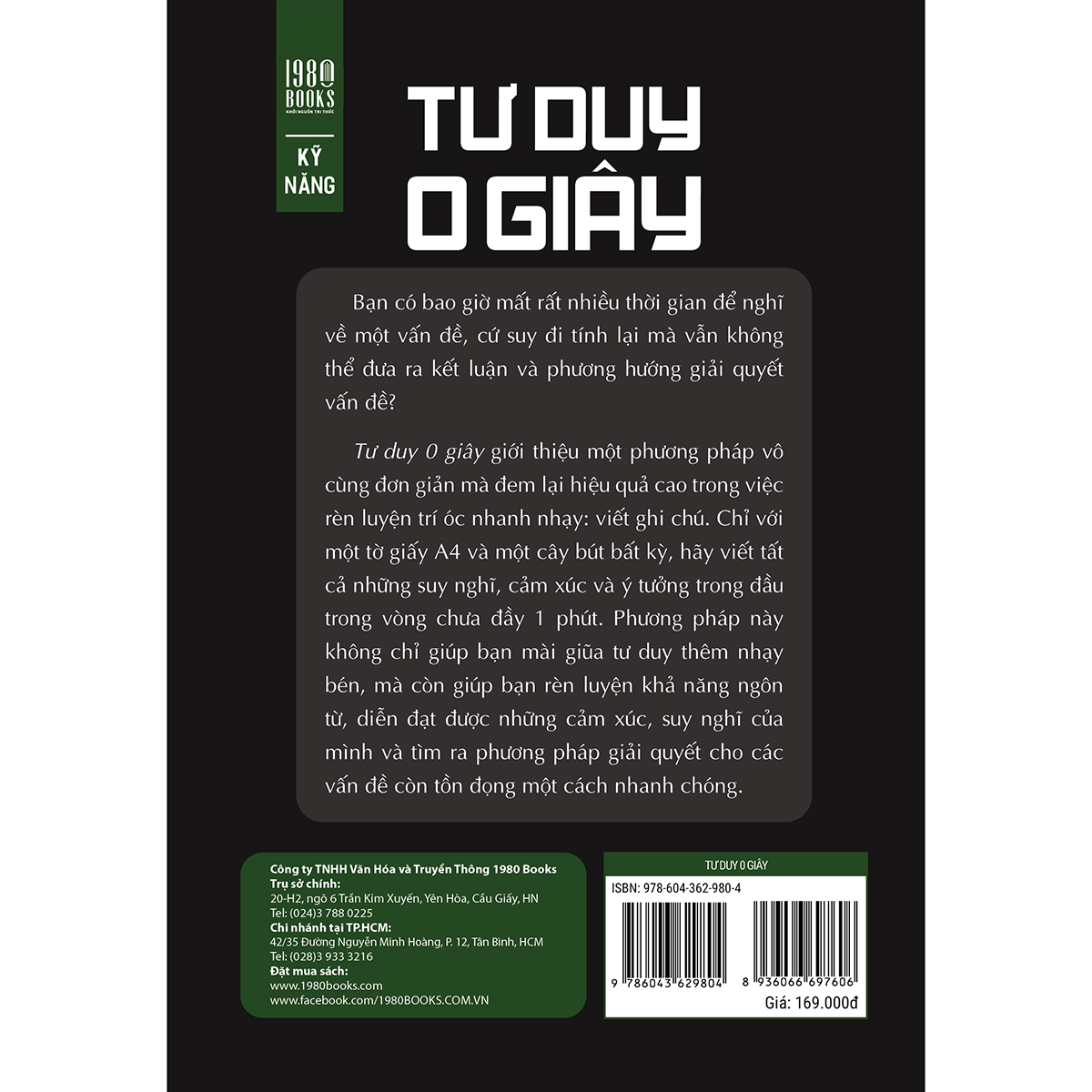 Trong cuốn sách “Tư duy 0 giây” giới thiệu một phương pháp vô cùng đơn giản mà đem lại hiệu quả cao trong việc rèn luyện trí óc nhanh nhạy hơn: viết ghi chú. Chỉ với một tờ giấy A4 và một cây bút bất kỳ, hãy viết tất cả những suy nghĩ, cảm xúc và ý tưởng trong đầu trong vòng chưa đầy 1 phút. Phương pháp này không chỉ giúp bạn mài giũa tư duy thêm nhạy bén, mà còn giúp bạn rèn luyện khả năng ngôn từ, diễn đạt được những cảm xúc, suy nghĩ của mình và tìm ra phương pháp giải quyết cho các vấn đề còn tồn đọng một cách nhanh chóng.