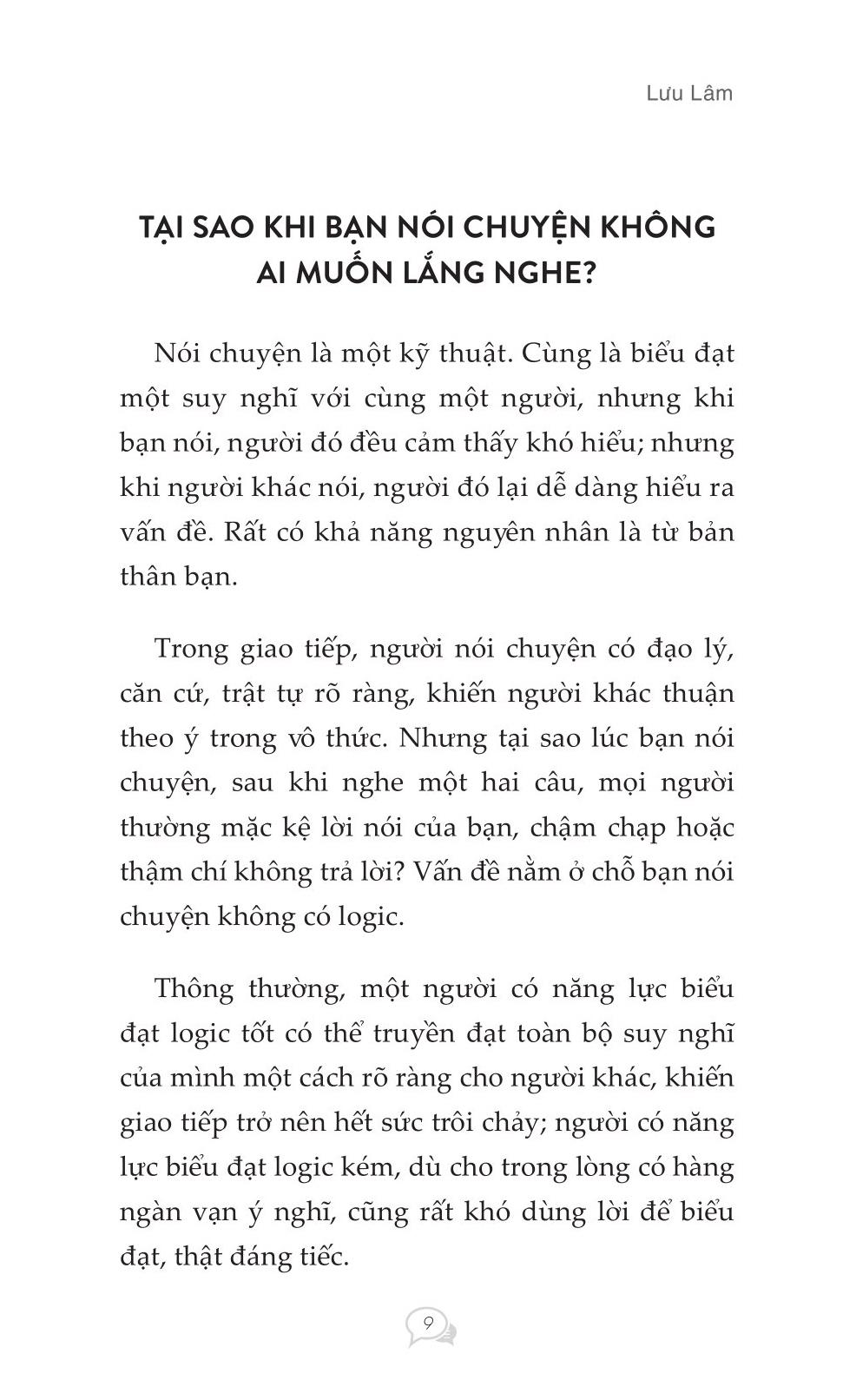 Khi giao tiếp và truyền đạt suy nghĩ của bạn với người khác, nếu không có tính logic, lời nói của bạn sẽ là chướng ngại vật cản trở giao tiếp giữa hai bên. Những mối quan hệ giữa các cá nhân phức tạp của xã hội hiện đại, cuộc sống và công việc nhịp độ nhanh đòi hỏi chúng ta phải có một "lời nói logic" thông minh hơn, sắc sảo hơn.