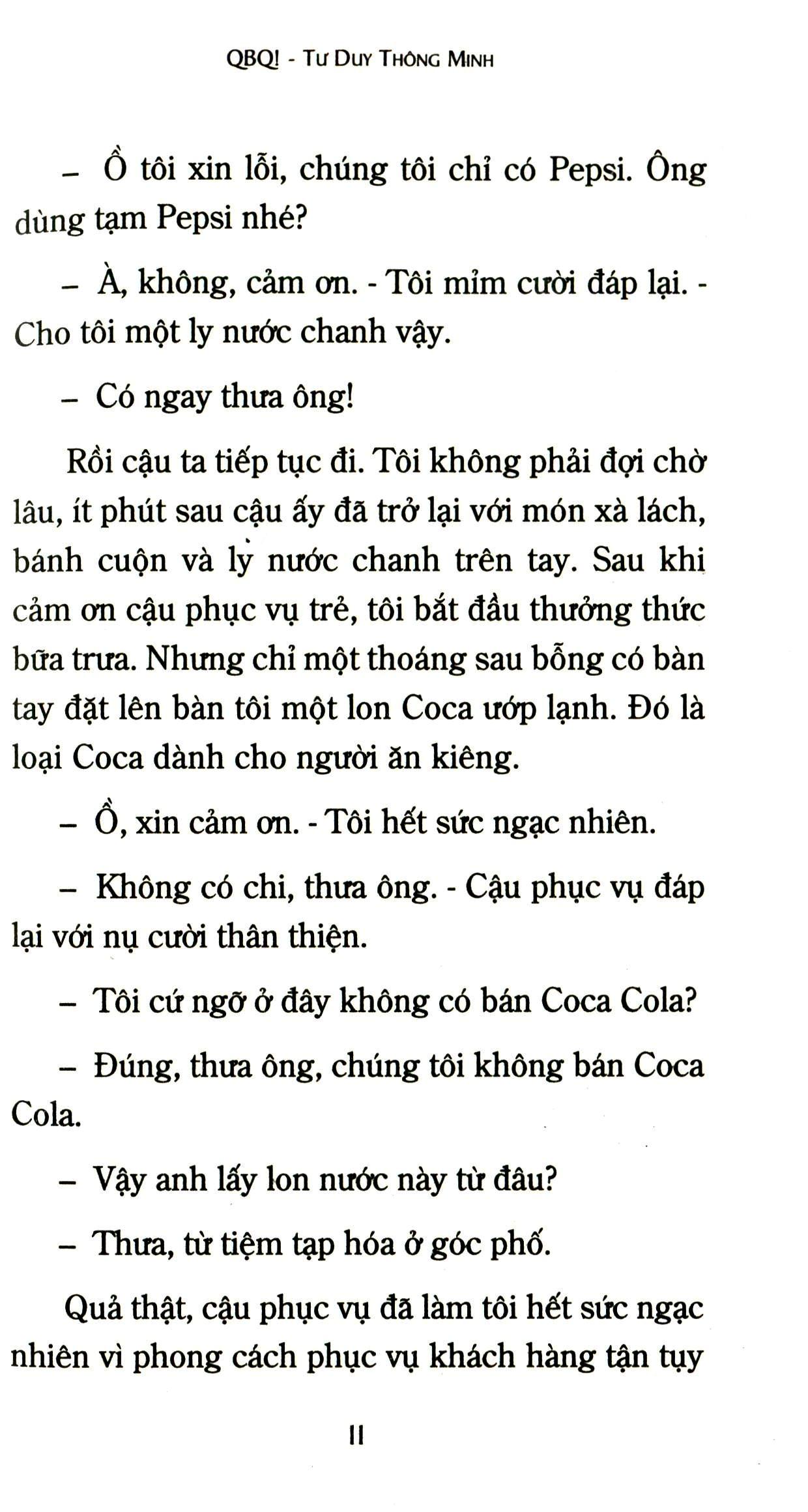 QBQ! - Tư Duy Thông Minh là một công cụ giúp bạn nhận diện giá trị thực sự của m.ình, dám nhìn thẳng vào trách nhiệm của bản thân từ trong suy nghĩ để vạch ra những phương hướng hành động thật thông minh. Bạn sẽ không còn phải lo âu, bối rối hay hoang mang vì những câu hỏi không lời giải đáp về những vướng mắc mà m.ình gặp phải trong công việc và cuộc sống. Ngược lại, bạn sẽ tìm thấy những câu hỏi tích cực do tinh thần QBQ mang lại. Bằng cách thực hành theo những gì QBQ hướng dẫn, cuộc sống của bạn sẽ thay đổi ngày một tốt đẹp hơn, và hiệu quả công việc của bạn sẽ ngày càng nâng cao.