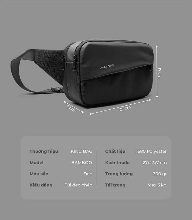Túi Đeo Chéo KINGBAG BAMBOO vải trượt nước, nhiều ngăn tiện dụng - Hàng Chính Hãng THÔNG SỐ KỸ THUẬT Chất liệu: 1680 Polyester Trọng lượng: 0.3 kg Kích thước: Rộng 27 cm x Sâu