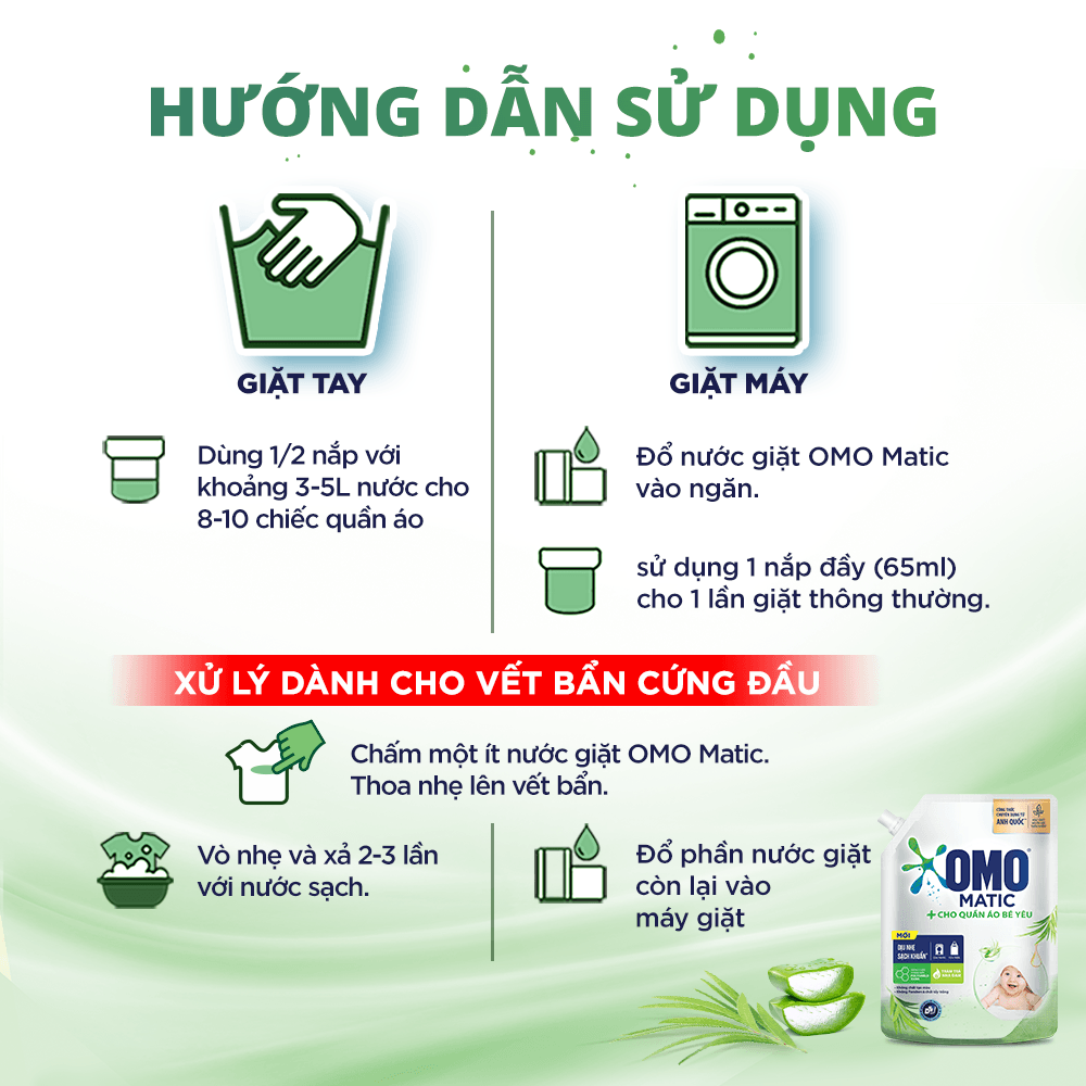 - Đổ phần nước giặt còn lại trong nắp vào máy giặt cùng với quần áo. Hướng dẫn bảo quản: Nơi thoáng mát, tránh ánh nắng trực tiếp Chú ý: Bao bì sản phẩm có thể thay đổi tùy theo từng đợt nhập hàng Thời gian “sử dụng tốt nhất” của các sản phẩm nước giặt Omo Matic (Unilever Việt Nam khuyến nghị, trong điều kiện lưu trữ như được hướng dẫn trên bao bì): 24 tháng từ ngày sản xuất. (Sau thời hạn “sử dụng tốt nhất” được khuyến nghị như trên, sản phẩm vẫn có thể tiếp tục sử dụng nếu được lưu trữ đúng như hướng dẫn trên bao bì. Tuy nhiên, một số các tính chất về cảm quan như mùi hương, màu sắc hoặc tính chất hóa lý của sản phẩm có thể thay đổi tùy vào điều kiện lưu trữ và bảo quản thực tế.)