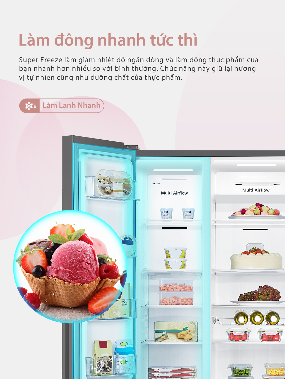 - Làm Lạnh Nhanh: Super Freeze làm giảm nhiệt độ ngăn đông và làm đông thực phẩm của bạn nhanh hơn nhiều so với bình thường. Chức năng này giữ lại hương vị tự nhiên cũng như dưỡng chất của thực phẩm.