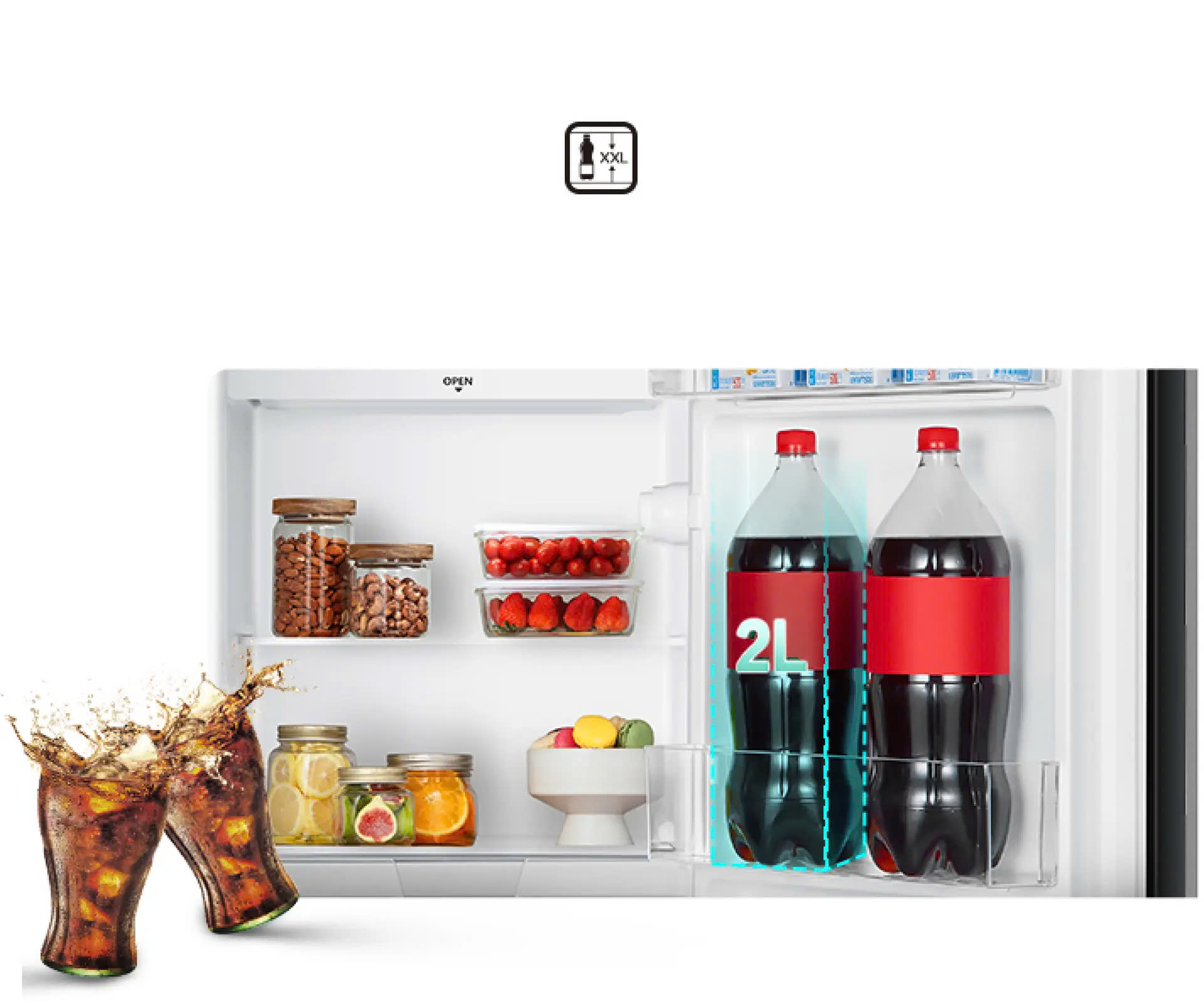 - Khay cửa tủ lạnh lớn XXL: có thể để vừa sữa, nước trái cây và chai soda 2 Lít ở ngay khay cửa tủ lạnh, dễ dàng sử dụng