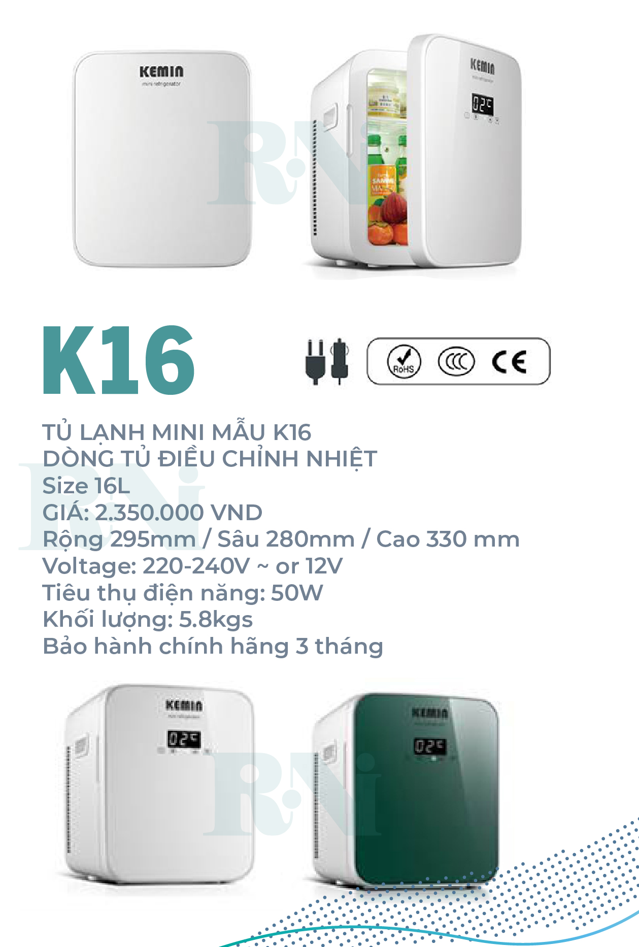 Mua tại TiktokTỦ LẠNH MINI KEMIN 16L LÀ DÒNG TỦ CHỈNH NHIỆT THEO Ý MUỐN kích thước: 35x32x29 cm Màn hình Led hiển thị hiện độ và điều chỉnh cảm ứng Làm nóng đến 65 độ C Làm lạnh 5-15 độ C Sử dụng ở nhà (220V-50W) và trên ô tô (12V) Mặt kính cường lực sang trọng Lưu ý: Do tủ sử dụng công nghệ làm lạnh bán dẫn nên sẽ xảy ra hiện tượng ngưng tụ hơi nước, khách hàng cần vệ sinh thường xuyên hoặc lót khăn dưới đáy tủ cho thấm hút nước TỦ LẠNH MINI KEMIN VIỆT NAM do Công ty CP Đầu tư Quốc tế RNI nhập khẩu và phân phối chính hãng tại Việt Nam Vậy tủ mini kemin phù hợp với những đối tượng nào ️