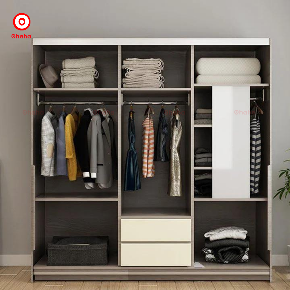 Bạn có thể lựa chọn tủ quần áo gỗ công nghiệp hiện đại Ohaha cánh lùa - CL027 với khối tủ nhiều ngăn kéo và khoang lưu trữ quần áo và các vật dụng cá nhân khác. Thiết kế thông minh của tủ quần áo gỗ công nghiệp ohaha có cánh lùa hiện đại tiết kiệm diện tích và an toàn khi mở mà còn cho phép tùy chỉnh theo ý muốn để phù hợp với nhu cầu sử dụng của mọi gia đình.