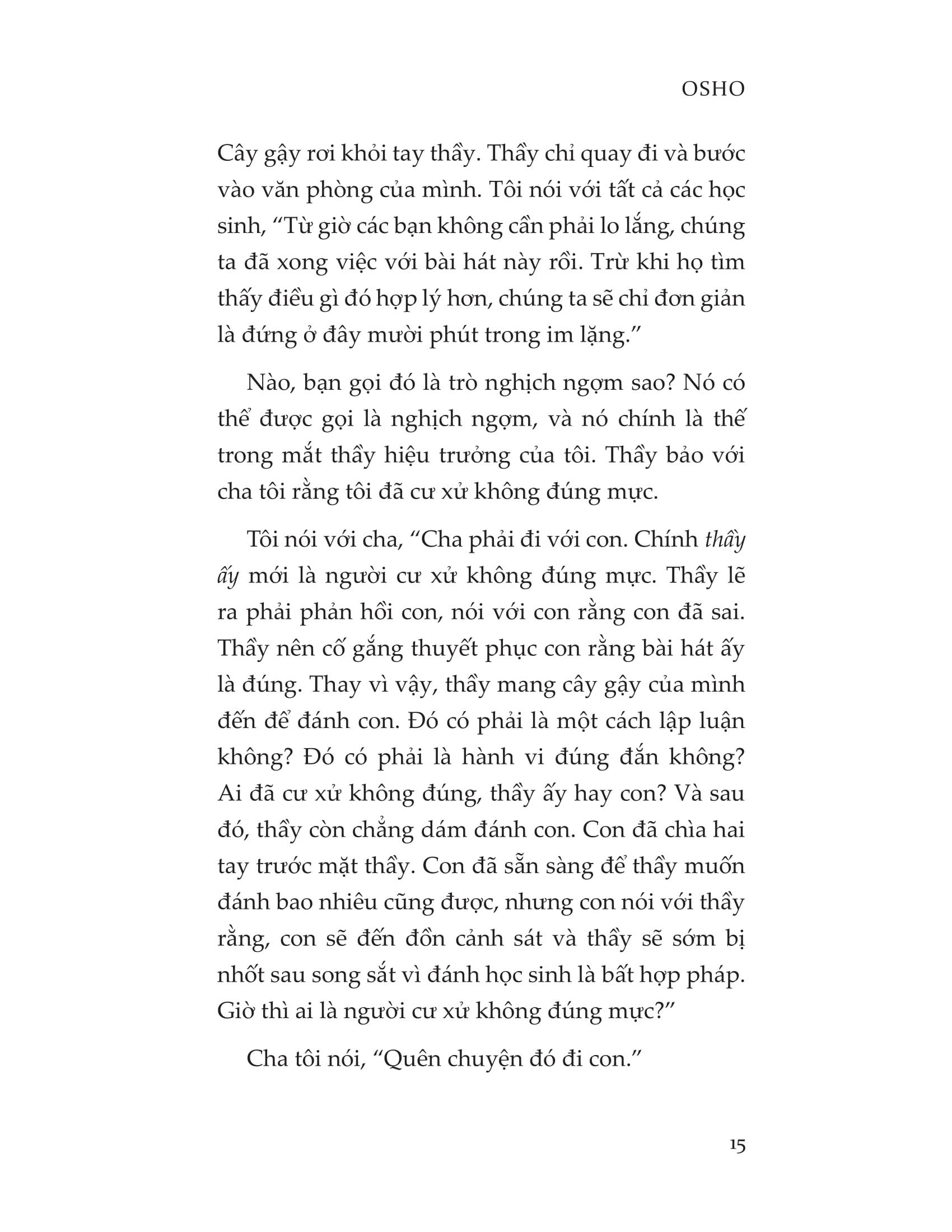 Osho (1931-1990) là một đạo sư người Ấn được hàng triệu người trên thế giới tìm đọc. Hàng trăm cuốn sách cùng vô số bài thuyết giảng của ông về đề tài tâm linh đã để lại những dấu ấn khó phai trong lòng công chúng. Giáo lý của Osho đậm chất phương Đông, nhấn mạnh tới tầm quan trọng của thiền và sự tỉnh thức, từ đó hướng người tu tập buông bỏ cái tôi, nuôi dưỡng tình thương yêu và đánh thức nguồn năng lượng nguyên thủy từ trong căn cốt.