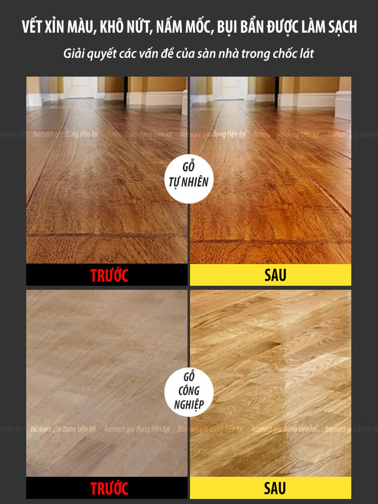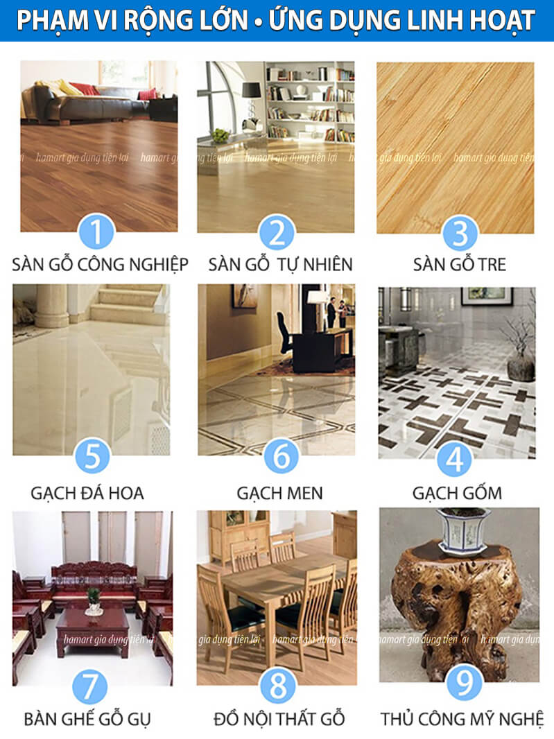 - Phạm vi áp dụng: Vệ sinh, làm sạch sàn gỗ, sàn đá, gạch men, bàn ghế gỗ, kệ gỗ…