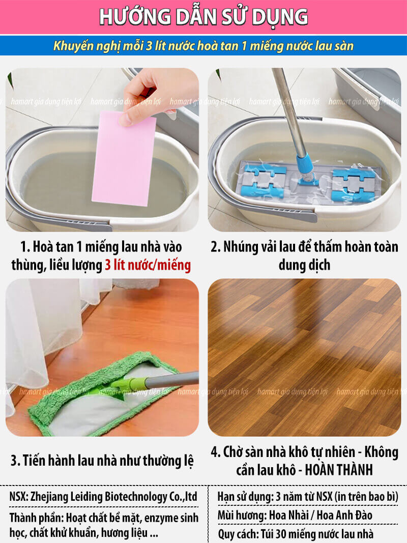 - Đóng gói: Túi zip 30 miếng nước lau sàn nhà