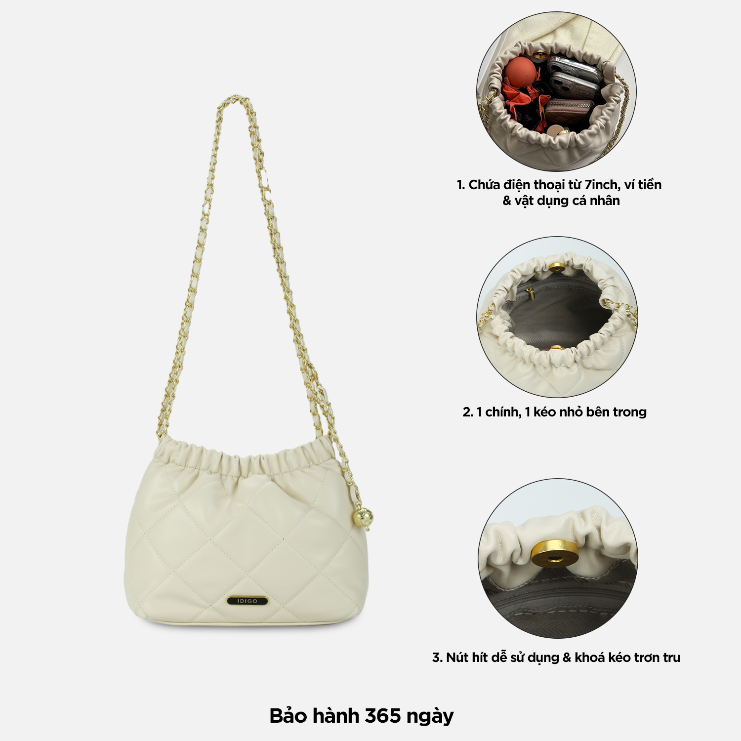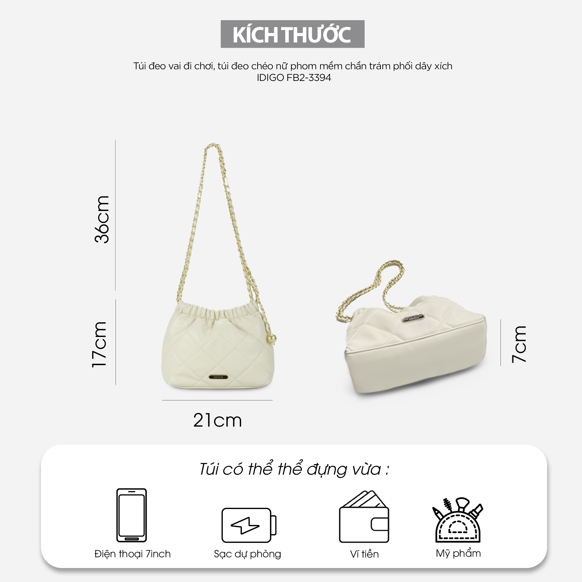 - Cách đeo: (1) đeo chéo (2) đeo vai Gam màu nữ tính, bền màu với thời gian, đường may chắc chắn. Chất liệu da tổng hợp có độ mềm vừa đủ tạo nên phom dáng túi, vừa có độ đàn hồi, vừa chống thấm nước nhẹ, bền đẹp và dễ dàng vệ sinh. Phom túi chữ nhật với chất liệu da có độ mềm vừa phải giúp túi hạn chế bị cong vênh, nhăn gãy khi sử dụng. Bên trong túi có 1 ngăn chính thích hợp đựng điện thoại 7inch trở, ví tiền, sổ tay nhỏ, sạc dự phòng, tai nghe, mỹ phẩm… Ngoài ra bên trong túi còn có 1 ngăn kéo nhỏ đựng chìa khoá, thẻ xe rất thích hợp sử dụng để đi làm, đi tiệc, đi chơi hay dạo phố. Túi có nút hít chắc chắn, dễ sử dụng cùng khóa kéo cao cấp hoạt động mượt mà và trơn tru. Đặc biệt, luân phiên đeo chéo/đeo vai với dây da phối xích cao 36cm giúp thay đổi phong cách. Sản phẩm túi xách này được IDIGO đặt sản xuất tại nhà máy Trung Quốc và nhập khẩu chính ngạch về Việt Nam, có thông tin sản phẩm nhập khẩu in rõ ràng trên tem nhãn. BẢO HÀNH SẢN PHẨM: